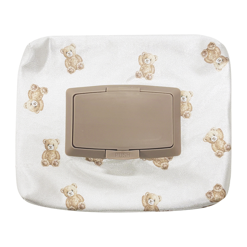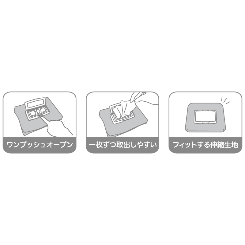 伸縮性のある生地で、おしりふきやウェットティッシュを包んで可愛くカバーします。 お部屋での使用はもちろん、お出かけにもおススメです。 フタは、おしりふきやウェットティッシュを一枚ずつ取出しやすいキバ付きで、ワンプッシュで開きます。