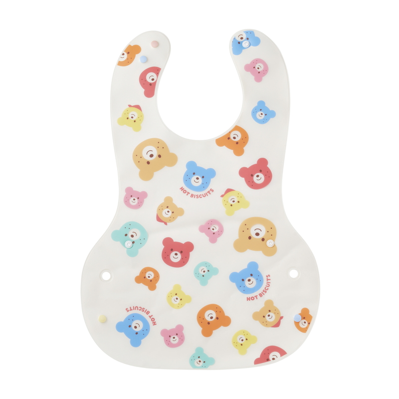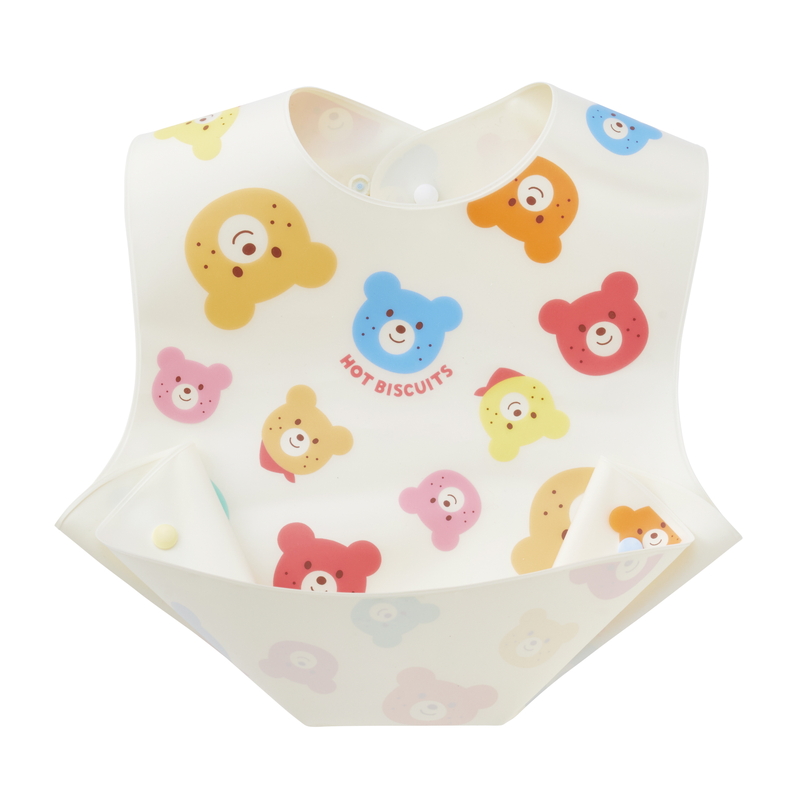 食べこぼしをキャッチできるように、スナップボタンをとめると立体的なポケットが作れ、