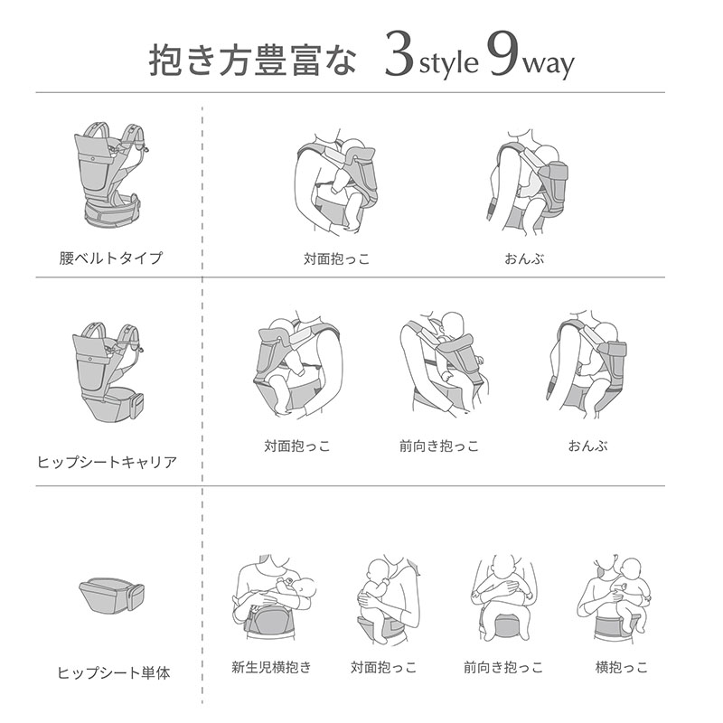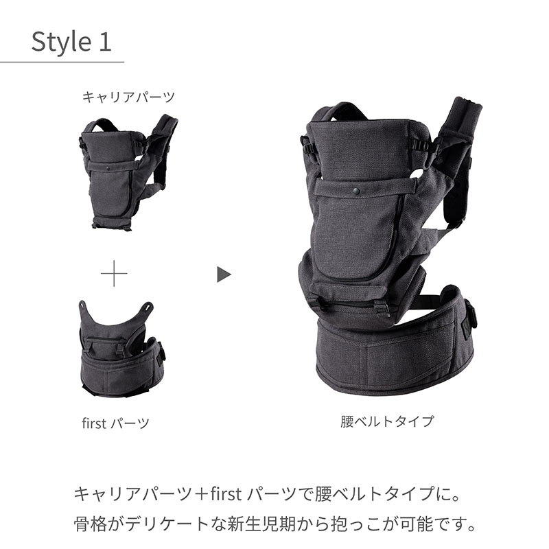 ●対象月齢:0ヵ月~48ヵ月頃まで(3.2kg~20kgまで) ●セット内容: ・ヒップシート ・ポーチ ・ベルト ・スリーピングフード ・ベルトカバー ・前向きよだれカバー ・収納袋 ●使い方: [firstパーツ+キャリア] ・対面抱っこ…0ヵ月~48ヵ月頃まで(3.2kg~20kgまで) ・おんぶ…4ヵ月頃(首すわり完了後)~48ヵ月頃(20kgまで) [ヒップシート+キャリア] ・対面抱っこ…4ヵ月頃(首すわり完了後)~48ヵ月頃(20kgまで) ・前向き抱っこ…7ヵ月頃(腰すわり完了後)~48ヵ月頃(20kgまで) ・おんぶ…7ヵ月頃(腰すわり完了後)~48ヵ月頃(20kgまで) [ヒップシート] ・対面抱っこ…4ヵ月頃(首すわり完了後)~48ヵ月頃(20kgまで) ・前向き抱っこ…4ヵ月頃(首すわり完了後)~48ヵ月頃(20kgまで) ・横抱っこ…0ヵ月~48ヵ月頃まで(20kgまで) ※ヒップシート単体の使用はSGマーク制度対象外です。