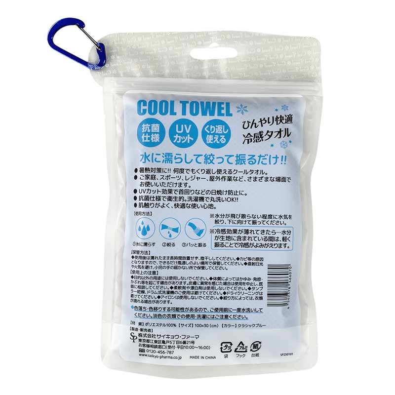 ●材質:ポリエステル100% ●サイズ(cm):100×30 ●使用方法 1)水に濡らす 2)絞る 3)パッと振る ※冷感効果が薄れてきたら 水分が生地に含まれている間は、軽く振ることで冷感がよみがえります。 水分が飛び散らない程度に水気を絞り、下に向けて振ってください。 ●使用上の注意 ・目的以外の用途には使用しないでください。 ・体質によっては、かゆみ・発疹・かぶれ等を起こす場合があります。皮膚に異常を感じた場合は使用を中止し、医師に相談してください。 ・柔軟剤や漂白剤は使用しないでください。 ・タンブラー乾燥、ドラム式洗濯機のご使用は避けてください。 ・ドライクリーニングは避けてください。 ・アイロンは使用しないでください。 ・絞り方によっては、衣類が濡れる場合があります。 色落ち・色移りする可能性があるので、ご使用前に一度水洗いしてください。 淡色の衣類での使用・洗濯にはご注意ください。