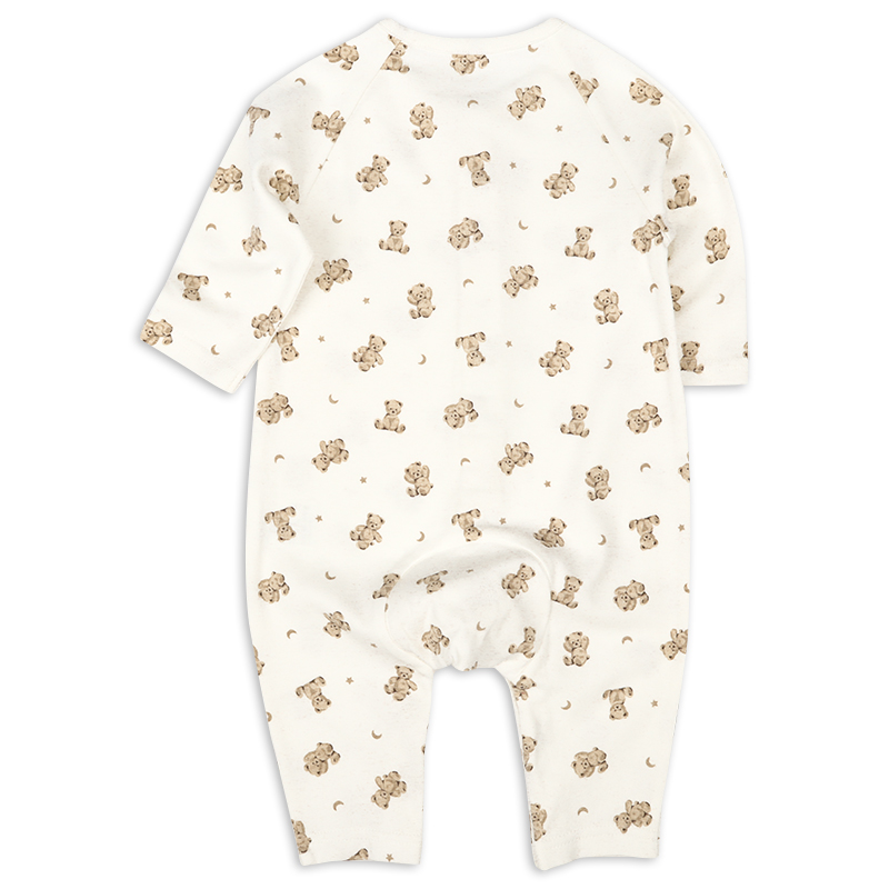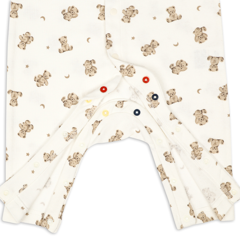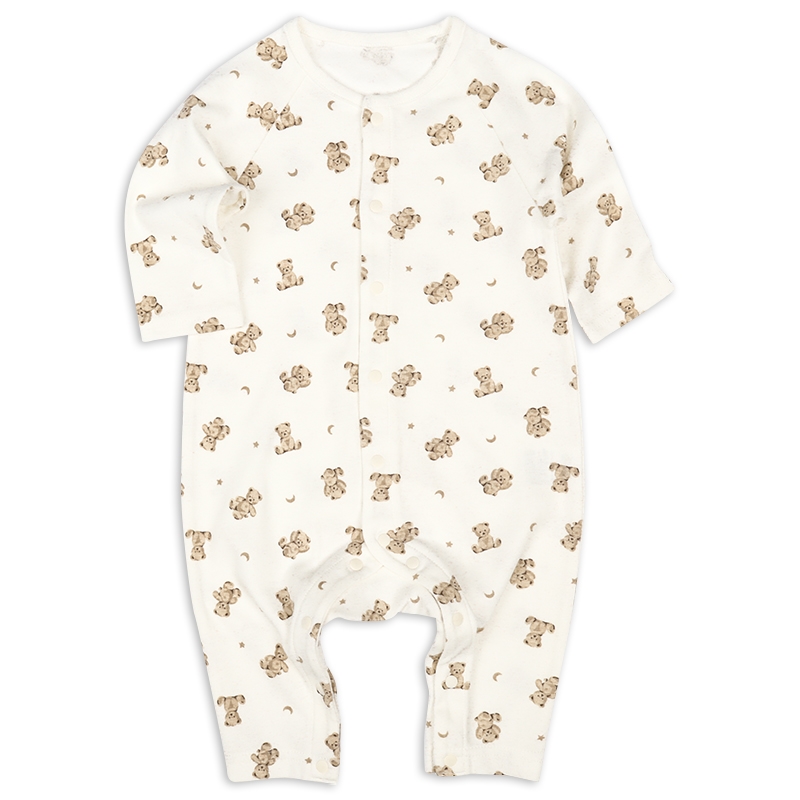 身頃部分に綿100%の生地を使用したシンプルなプレオールです。 ボタンは付け間違い防止の為に股部分が配色になっております。 シンプルなデザイン・シルエットなので着て行く場所を選びません。 カラーも可愛く、毎日でも着たくなる1着です。