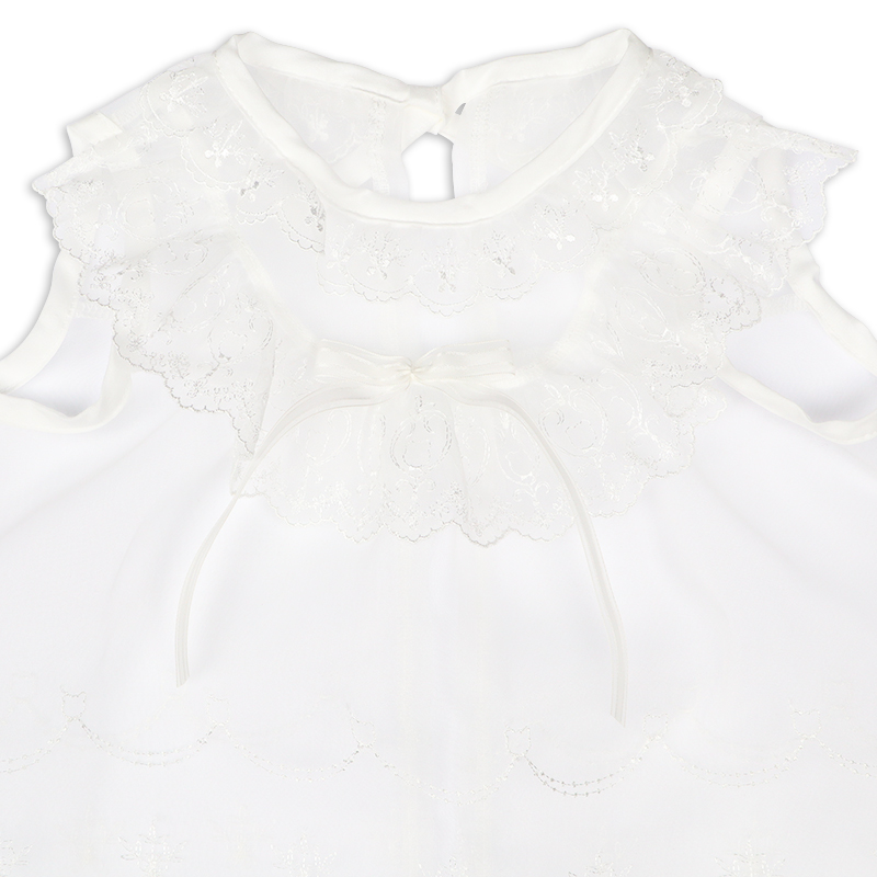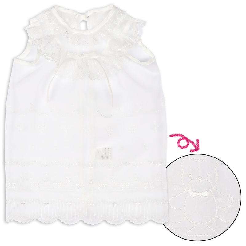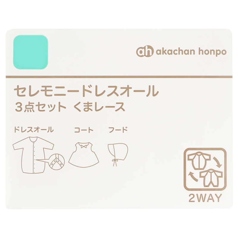 くま柄のレースのオーガンジーがついたオーバードレスが豪華なセレモニードレスオール3点セット。 ドレスオールとフードはやわらかいスムース生地です。 ベビードレス・フード・ツーウェイドレスオールの3点セットです。