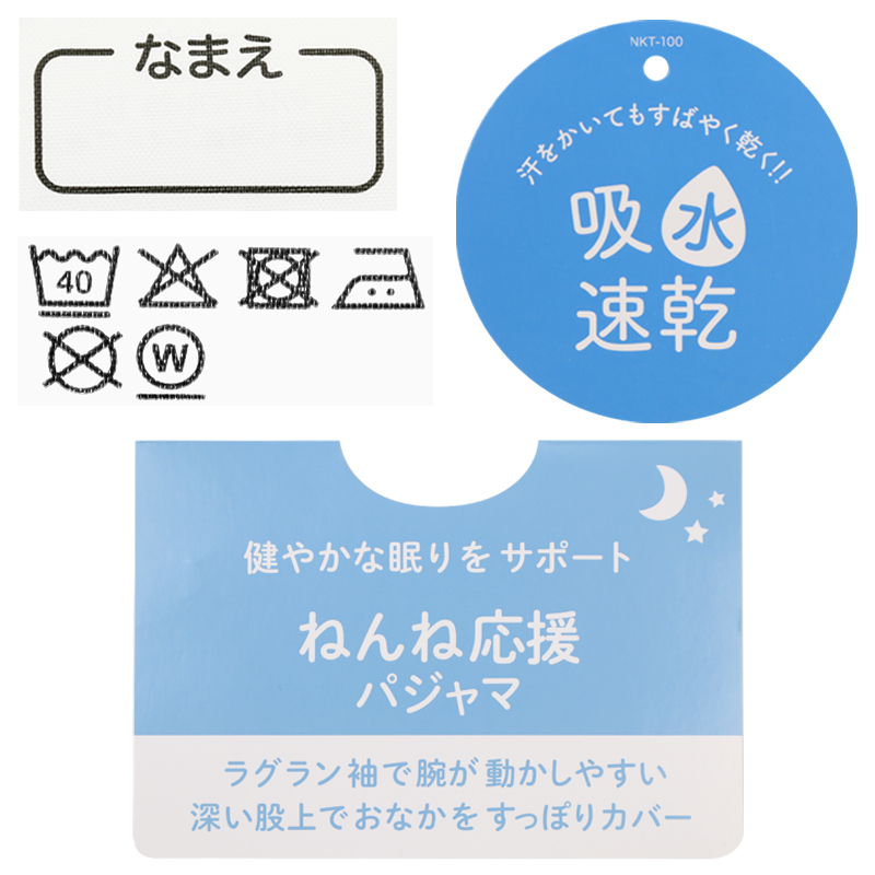 寝返りが多くなるお子さまの快適な睡眠をサポートする、ねんね応援パジャマです。 素材は伸びやすくて着心地が良い、綿100%のフライス素材になります。 汗をかいてもすばやく乾く吸水速乾機能付き。 後ろの衿ぐりはゴム仕様で着脱しやすく、腕は動きやすいラグラン袖仕様、 お腹が出にくいように股上は深い仕様になっています。 保育園でのお着替えなどにも便利な、名前を書いても滲みにくいおなまえ欄付き。