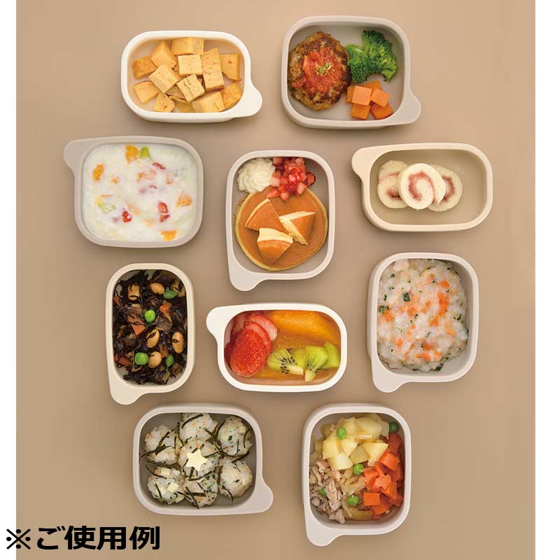 トライシリーズにひっくり返しを防ぐ、シリコーンタイプの食器が仲間入り。 離乳食の保存、レンジ解凍、食べ与えまで、離乳食初期から多用途に使える小分けカップです。 保存に便利なフタ付き。 冷蔵・冷凍庫で積み重ねてスッキリ収納できます。 別売りのわけわけフリージングブロックトレーで冷凍した離乳食が収まります。 カップ小:わけわけフリージングブロックトレーR 50 カップ大:わけわけフリージングブロックトレー 80 別売りのトライすくいやすいシリコーンプレートと組み合わせることで、仕切りや小鉢として使用できます。 ヨーグルトや汁物を入れて。目盛りがついているので、容量がわかります。 つまみがついているので、プレートにセットされていても、カップの取り替えが簡単です。 プラチナシリコーン使用で、シリコーン特有のニオイが少なく、耐久性に優れた素材です。