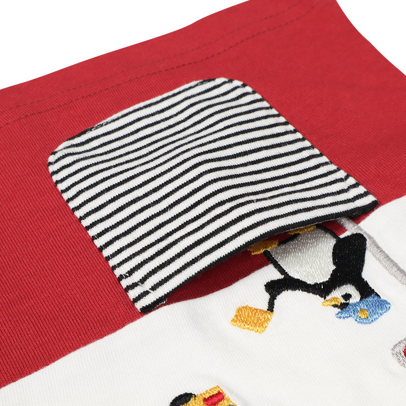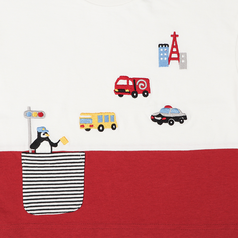 肌触りがよく吸水性にも優れた綿100%の素材です。 ベビーサイズは着脱しやすい肩開き仕様です。 人気の動物や乗り物の刺繍が前身頃全体に入っており、切替部分には ボーダー柄のポケットからアニマル刺繍が飛び出しているデザイン性の高いアイテムです。 園でも使える名前ネーム付き。