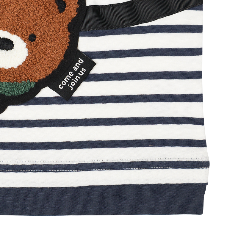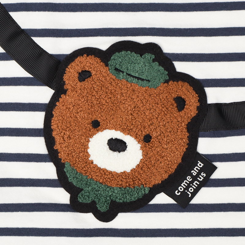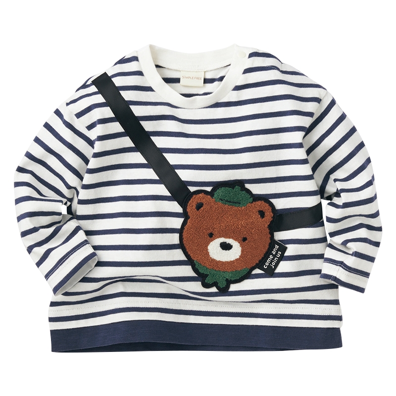 肌触りがよく吸水性にも優れた綿100%の素材です。 ベビーサイズは着脱しやすい肩開き仕様です。 ポシェットを持っているように見える楽しい柄のトレーナーです。 凹凸感のあるアップリケがポイントです。 園でも使える名前ネーム付き。