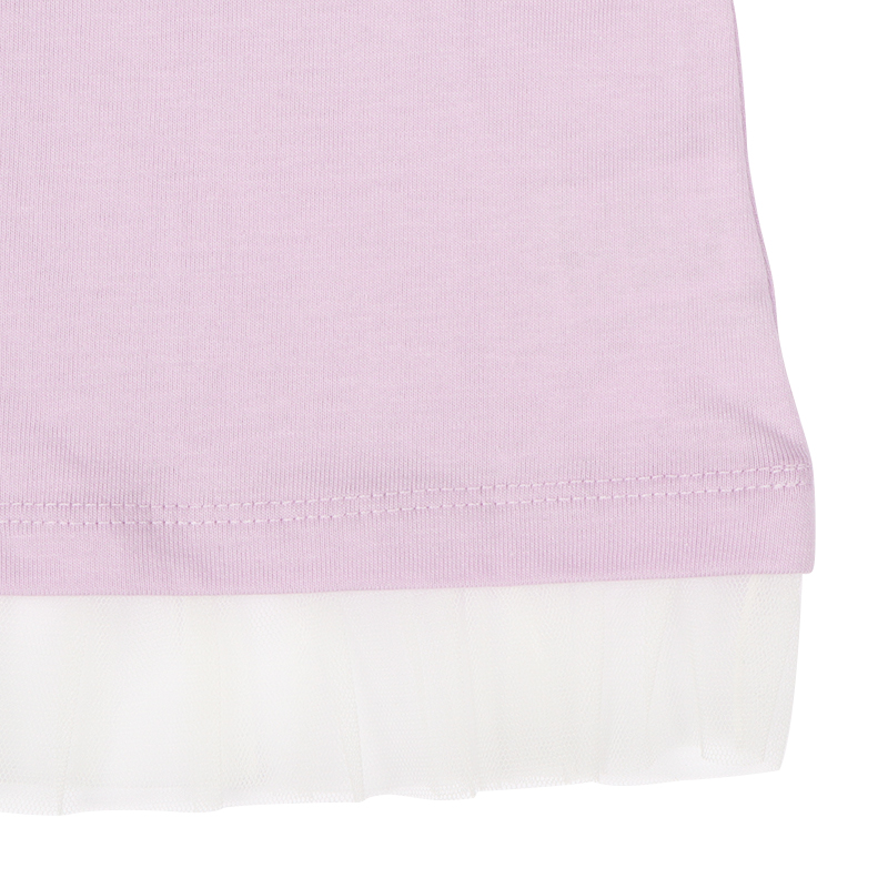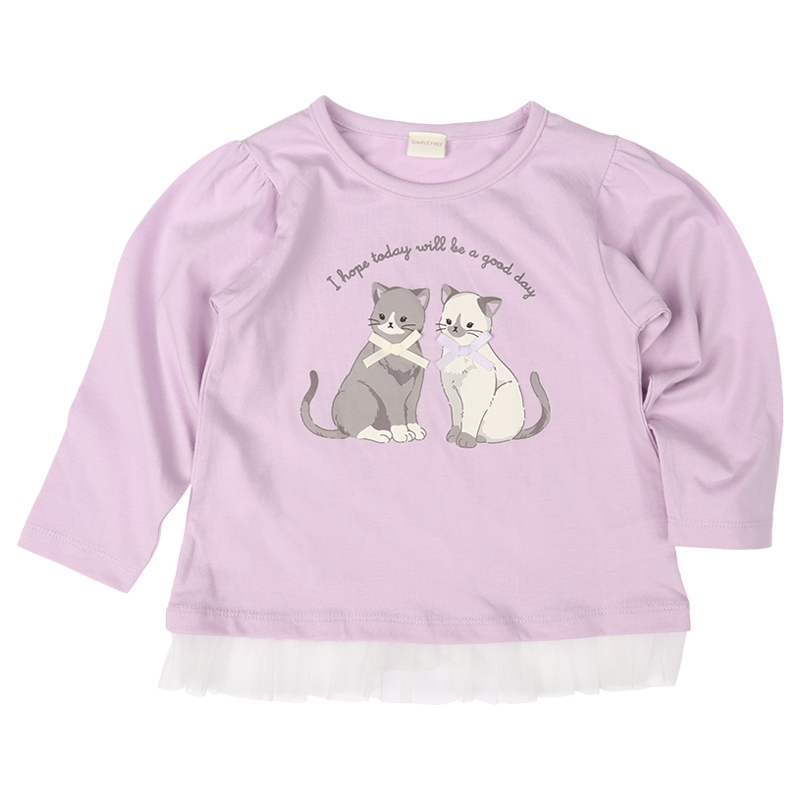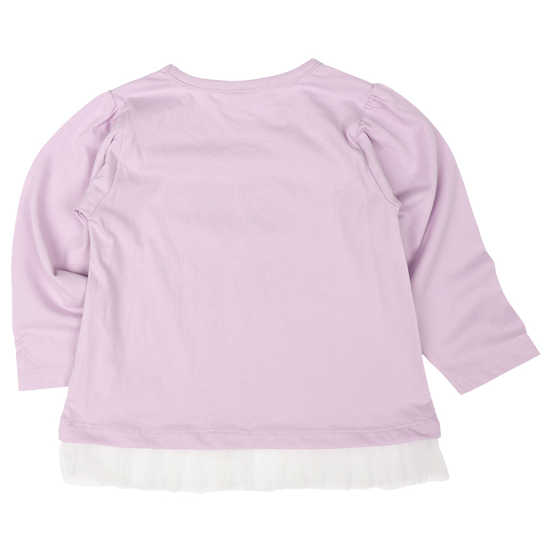 ●素材=本体:綿60%ポリエステル40% リブ部分:綿58%ポリエステル39%ポリウレタン3% チュール部分:ポリエステル100% ●寸法(約・cm)= [100cm]着丈41・胸囲62・肩幅25・袖丈32 [110cm]着丈44・胸囲66・肩幅27・袖丈36.5 [120cm]着丈47・胸囲70・肩幅29・袖丈41