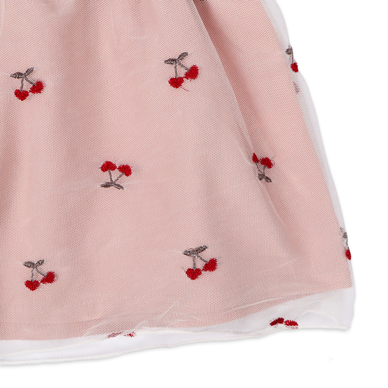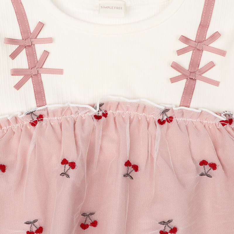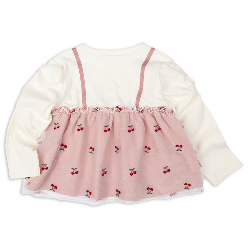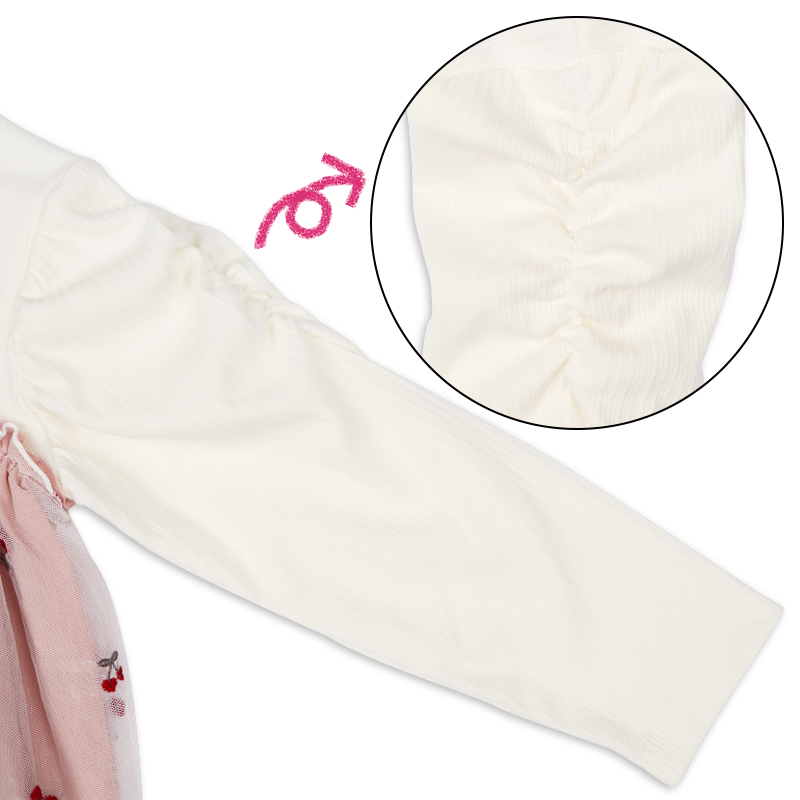 ●素材=本体:綿56%ポリエステル37%ポリウレタン7% 切替部分:綿100% チュール部分:ポリエステル100% ●寸法(約・cm)= [100cm]着丈39・胸囲62・肩幅26・袖丈31.5 [110cm]着丈42・胸囲66・肩幅28・袖丈36 [120cm]着丈45・胸囲70・肩幅30・袖丈40.5