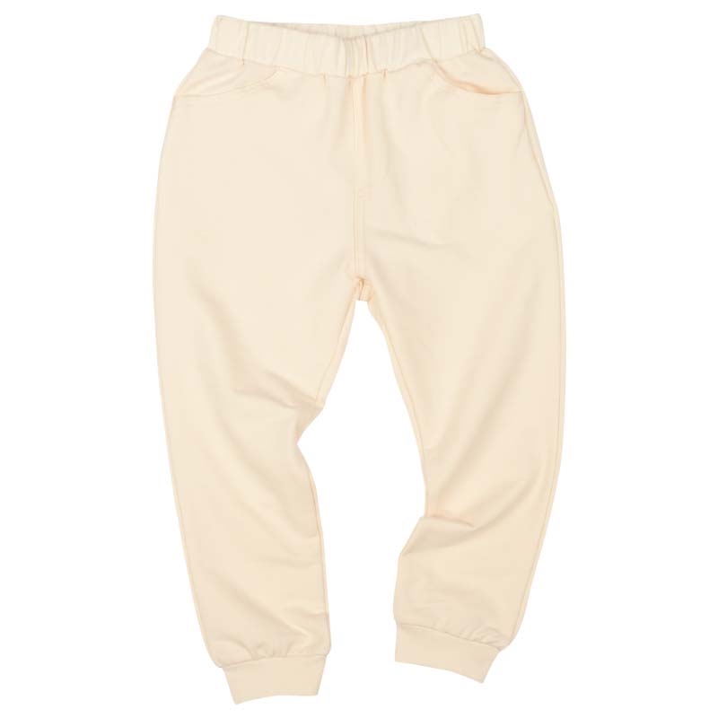 伸縮性があるカットソー生地を使用しました。はき心地の良さが特徴です。 程よい厚さなので、丈夫で、長いシーズン着用できます。 ヒップをキチンと包み込み形、両脇部分でウエストゴムを固定したゴムねじれを防止など、 ストレスフリーで、いつでもはきたくなるパンツです。 裾にリブを付けた少しゆったりシルエットです。 名前が書けるお名前タグ付きです。