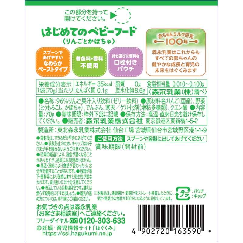 ●96%りんご果汁入り飲料(ゼリー飲料) ●原材料名:りんご(国産)、野菜(とうもろこし、かぼちゃ)、でんぷん、寒天、ゲル化剤(増粘多糖類)、クエン酸 ●内容量:70g ●栄養成分:その他(画像でご確認いただけます)