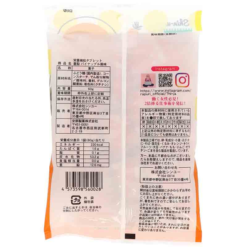 ●菓子 ●原材料名:ぶどう糖(国内製造)、コーンスターチ、でん粉分解物/酸味料、香料、グルコン酸亜鉛、着色料(クチナシ) ●内容量:60g ●栄養成分:その他 熱量 220kcal たんぱく質 1.6g 脂質 0.1g 炭水化物 53.2g 食塩相当量 0.0g 亜鉛 12.6mg