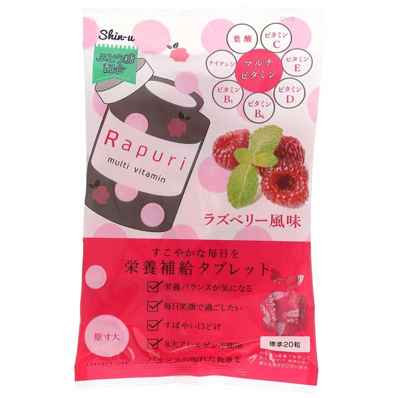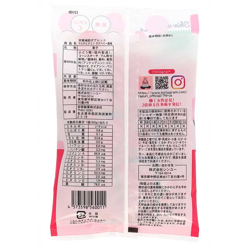 ●菓子 ●原材料名:ぶどう糖(国内製造)、コーンスターチ、でん粉分解物/酸味料、香料、着色料(アントシアニン)、V.C、抽出V.E、ナイアシン、パントテン酸Ca、V.B1、V.B6、V.B2、V.A、葉酸、V.D、V.B12 ●内容量:60g ●栄養成分:その他 熱量 219kcal たんぱく質 0.8g 脂質 0.1g 炭水化物 53.8g 食塩相当量 0.0g ナイアシン 6.6mg パントテン酸 2.2mg ビタミンA 66.6μg ビタミンB1 0.6mg ビタミンB2 0.3mg ビタミンB6 0.5mg ビタミンB12 0.9μg ビタミンC 50.4mg ビタミンD 2.0μg ビタミンE 1.9mg 葉酸 78.0μg