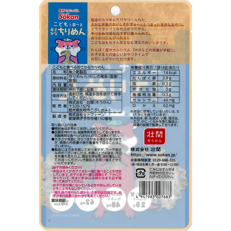●魚介乾製品 ●原材料名:ちりめん(いわしの稚魚(国産)、食塩) ●内容量:4g ●栄養成分:1袋(4g)あたり 熱量 14kcal たんぱく質 2.9g 脂質 0.3g 炭水化物 0g 食塩相当量 0.3g カルシウム 48mg DHA 62mg