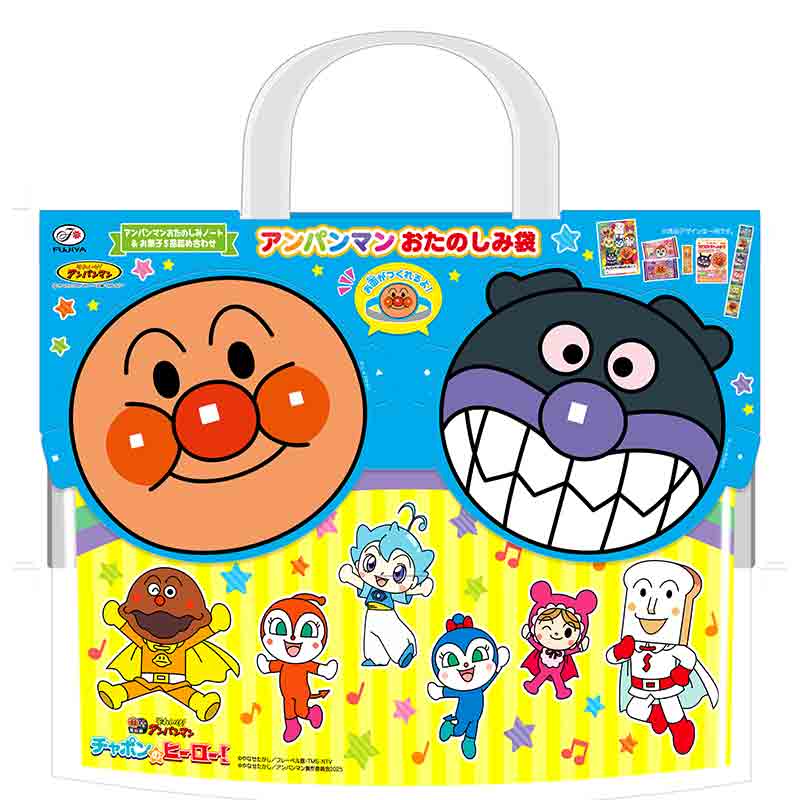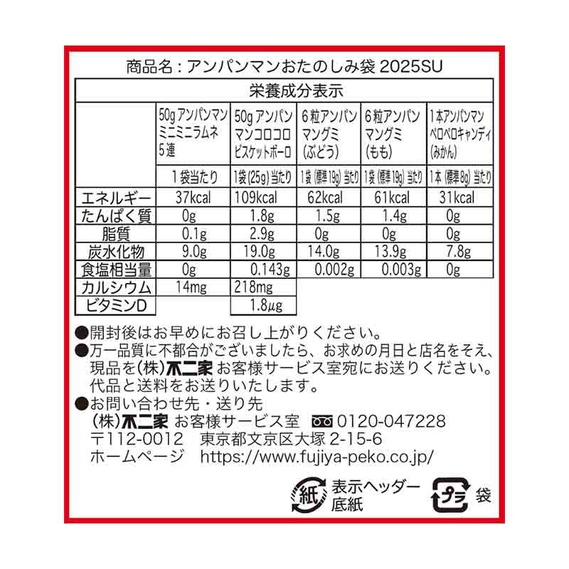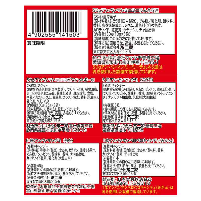 ●50gアンパンマンミニミニラムネ5連 ・清涼菓子 ・原材料名:ぶどう糖(国内製造)、でん粉/乳化剤、酸味料、香料、卵殻未焼成カルシウム、着色料(ブドウ色素、カロテノイド、紅花黄、クチナシ)、チャ抽出物 ・内容量:50g(10g×5袋) ・栄養成分:1袋当たり 熱量 37kcal たんぱく質 0g 脂質 0.1g 炭水化物 9.0g 食塩相当量 0g カルシウム 14mg ●50gアンパンマンコロコロビスケットボーロ ・ビスケット ・原材料名:小麦粉(国内製造)、でん粉、砂糖、植物油脂、卵、粉末状小麦たん白、異性化液糖、脱脂粉乳、食塩、牛乳/貝カルシウム、膨脹剤、カラメル色素、香料(乳由来)、乳化剤、V.E、V.D ・内容量:50g(25g×2袋) ・栄養成分:1袋(25g)当たり 熱量 109kcal たんぱく質 1.8g 脂質 2.9g 炭水化物 19.0g 食塩相当量 0.143g カルシウム 218mg ビタミンD 1.8μg ●6粒アンパンマングミ(ぶどう) ・キャンデー ・原材料名:砂糖(タイ製造)、水あめ、ゼラチン、濃縮ぶどう果汁、でん粉/ソルビット、酸味料、香料、着色料(アントシアニン、クチナシ)、チャ抽出物、乳化剤(大豆由来) ・内容量:6粒 ・栄養成分:1袋(標準19g)当たり 熱量 62kcal たんぱく質 1.5g 脂質 0g 炭水化物 14.0g 食塩相当量 0.002g ●6粒アンパンマングミ(もも) ・キャンデー ・原材料名:砂糖(タイ製造)、水あめ、ゼラチン、濃縮もも果汁、でん粉/ソルビット、酸味料、香料、チャ抽出物、カロテノイド色素、乳化剤(大豆由来) ・内容量:6粒 ・栄養成分:1袋(標準19g)当たり 熱量 61kcal たんぱく質 1.4g 脂質 0g 炭水化物 13.9g 食塩相当量 0.003g ●1本アンパンマンペロペロキャンディ(みかん) ・キャンデー ・原材料名:砂糖(国内製造)、水あめ/酸味料、香料、カロテノイド色素、チャ抽出物 ・内容量:1本 ・栄養成分:1本(標準8g)当たり 熱量 31kcal たんぱく質 0g 脂質 0g 炭水化物 7.8g 食塩相当量 0g