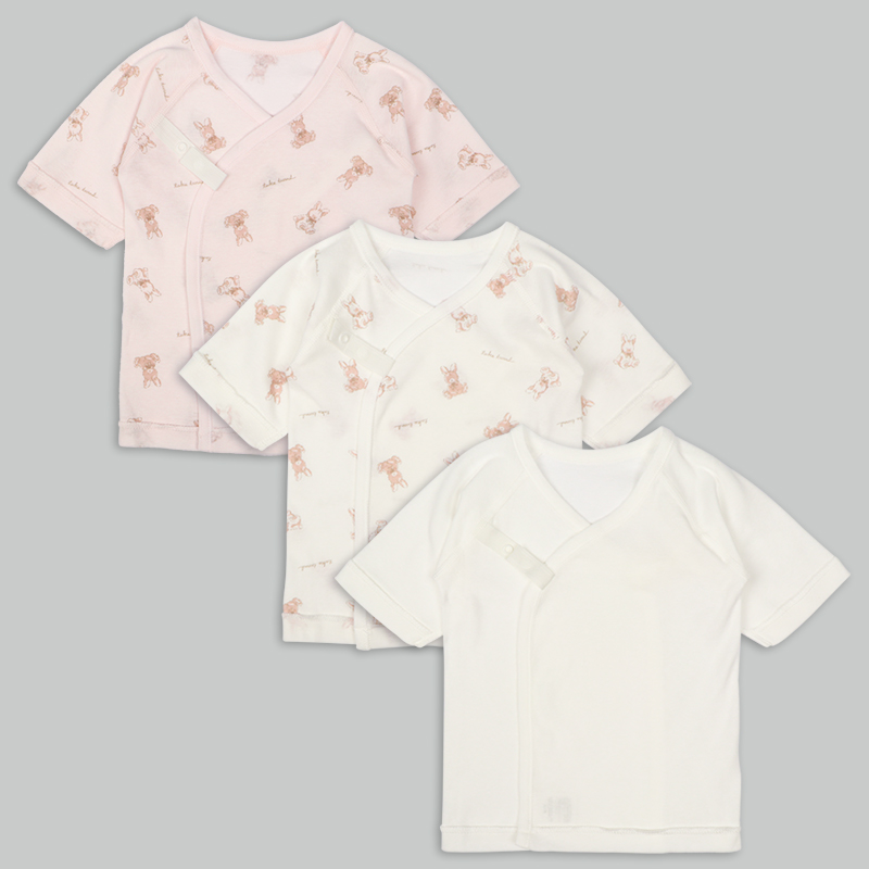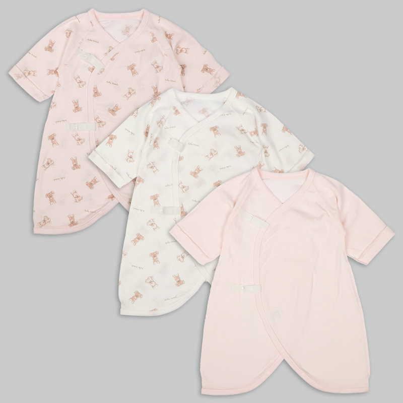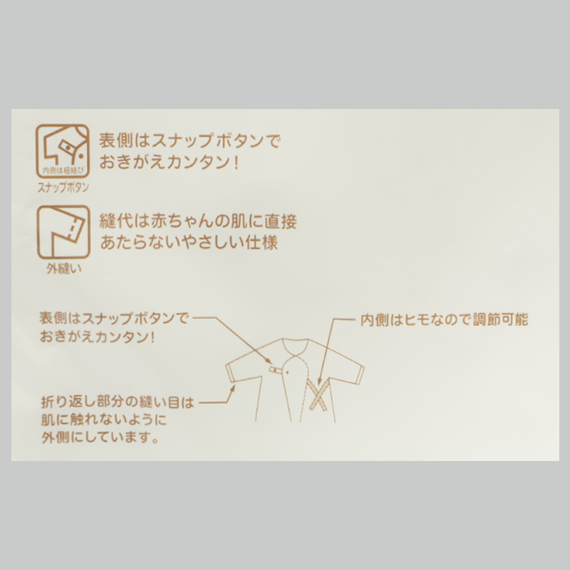 赤ちゃんに必要な基本の肌着をセットしました。 肌触りの良い綿100%のフライス生地使用。 縫いしろは赤ちゃんの肌に直接あたらないやさしい仕様。 外側はスナップタイプでお着替え簡単。 内側はひもタイプで調節可能で肌当たりもやさしい