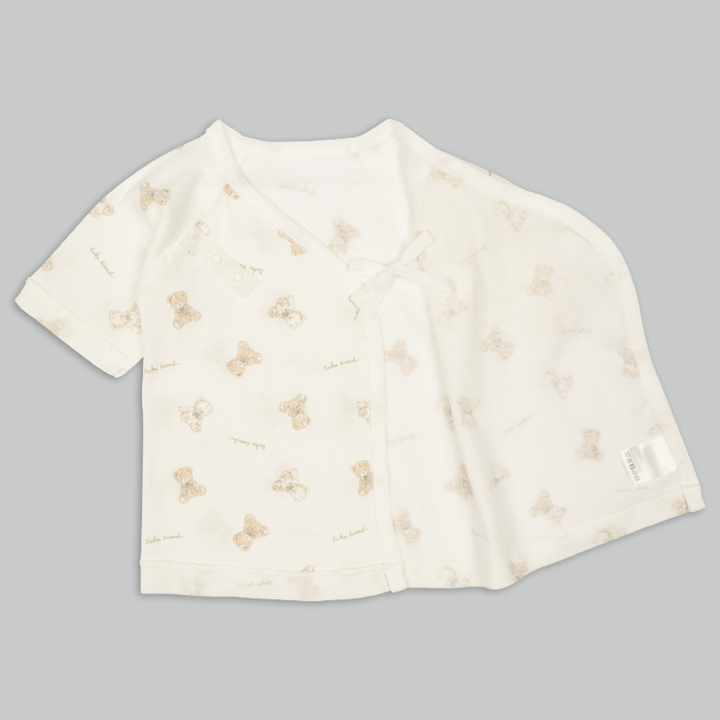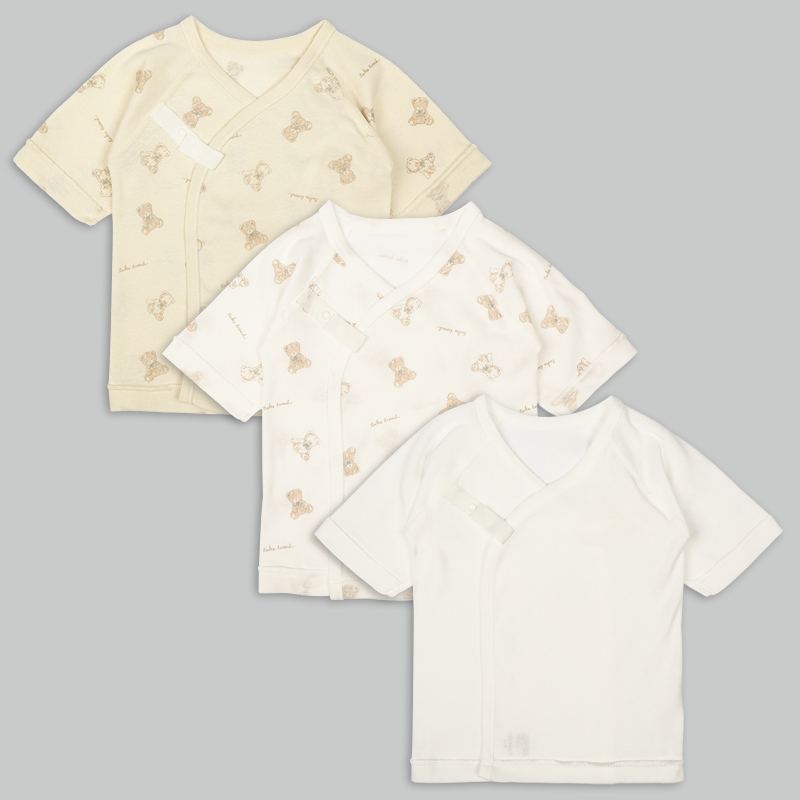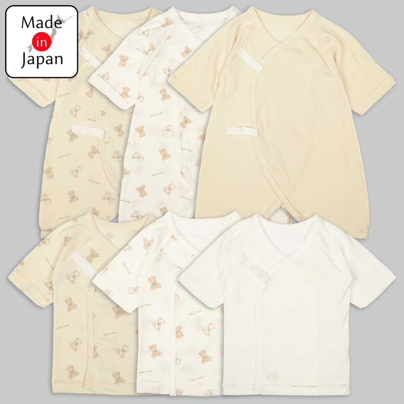 赤ちゃんに必要な基本の肌着をセットしました。 肌触りの良い綿100%のフライス生地使用。 縫いしろは赤ちゃんの肌に直接あたらないやさしい仕様。 外側はスナップタイプでお着替え簡単。 内側はひもタイプで調節可能で肌当たりもやさしい