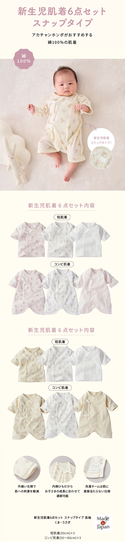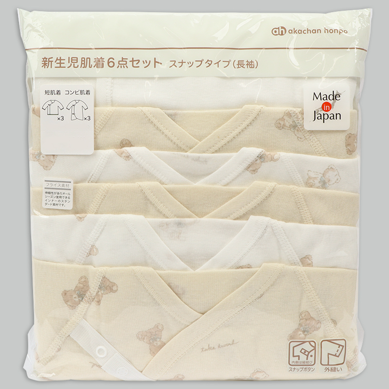 ●セット内容=長袖短肌着3枚・長袖コンビ肌着3枚 ●サイズ(約・cm)=短肌着:50cm コンビ肌着:50~60cm ●素材=綿100% ●原産国=日本