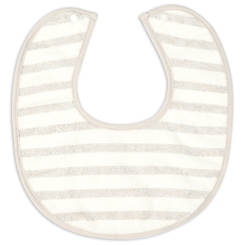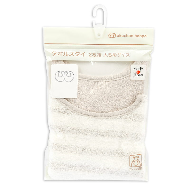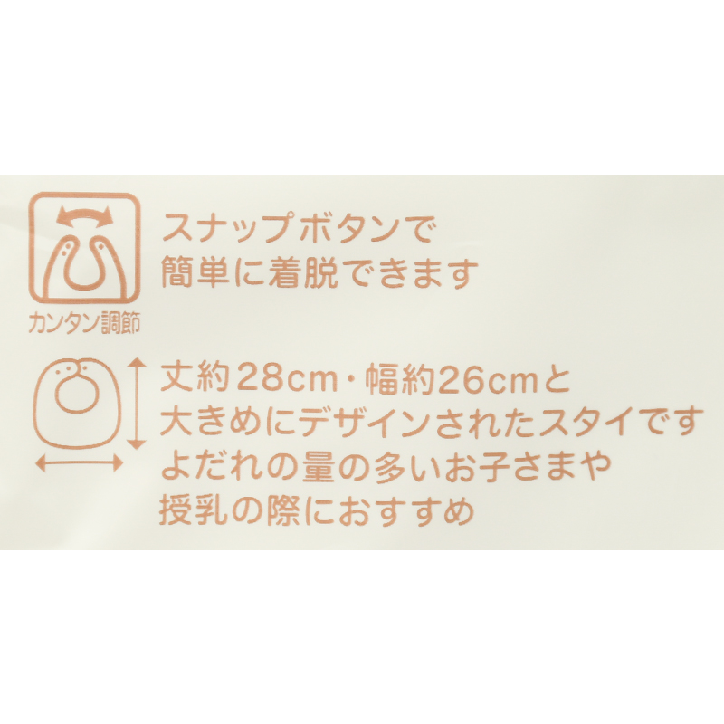大きめサイズで首回りをしっかりカバーするスタイです。 綿100%で心地よい肌触りのやわらかなタオル生地を使用しています。 首元はスナップボタンで着脱が簡単です。 吸水性にも優れているのでよだれをしっかり吸収します。