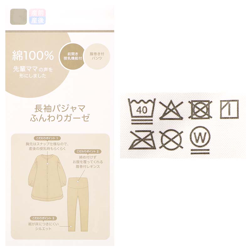 ●素材=トップス・パンツ 綿 100% ●洗濯表示=液温は40度を限度とし洗濯機で非常に弱い操作での洗濯処理ができる。漂白処理はできない。タンブル乾燥禁止。日陰でのつり干し乾燥がよい。アイロン仕上げ処理はできない。ドライクリーニング処理はできない。非常に弱い操作でのウエットクリーニング処理ができる。 ●サイズスペック=トップス M-L 着丈 85 身幅 55 肩線 52.3 袖丈 49.5 袖口 11 L-LL 着丈 90 身幅 58 肩線 53.8 袖丈 51 袖口 11.5 パンツ M-L ウエスト 28.5 股下 65 裾幅 12 脇総丈 98.6 L-LL ウエスト 30.5 股下 67 裾幅 12.5 脇総丈 101.6 ●対象期間=産前~産後