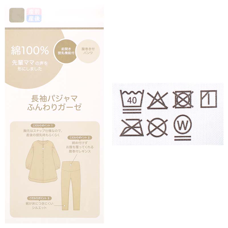 ●素材=トップス・パンツ 綿 100% ●洗濯表示=液温は40度を限度とし洗濯機で非常に弱い操作での洗濯処理ができる。漂白処理はできない。タンブル乾燥禁止。日陰でのつり干し乾燥がよい。アイロン仕上げ処理はできない。ドライクリーニング処理はできない。非常に弱い操作でのウエットクリーニング処理ができる。 ●サイズスペック=トップス M-L 着丈 85 身幅 55 肩線 52.3 袖丈 49.5 袖口 11 L-LL 着丈 90 身幅 58 肩線 53.8 袖丈 51 袖口 11.5 パンツ M-L ウエスト 28.5 股下 65 裾幅 12 脇総丈 98.6 L-LL ウエスト 30.5 股下 67 裾幅 12.5 脇総丈 101.6 ●対象期間=産前~産後