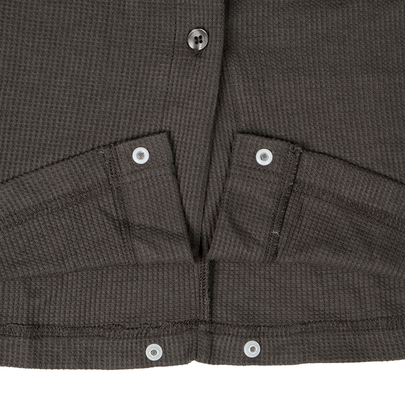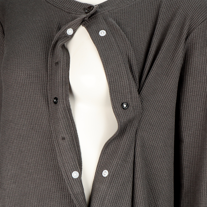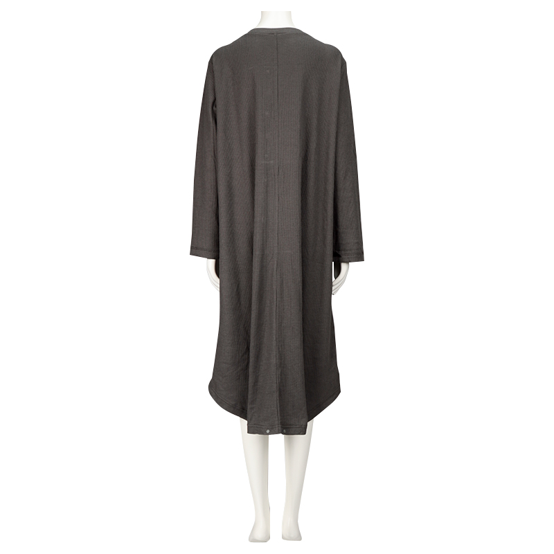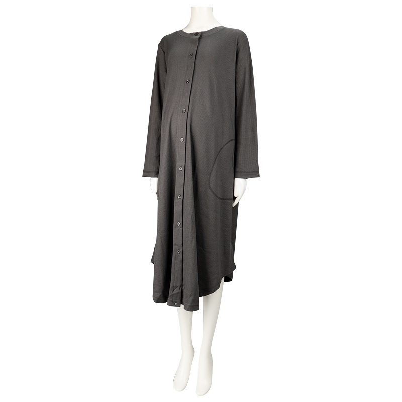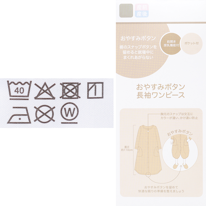 ●素材=ポリエステル65% 綿35% ●洗濯表示=液温は40℃を限度とし、洗濯機で弱い操作で洗濯処理ができる。漂白処理はできない。洗濯処理後のタンブル乾燥はできない。日陰でのつり干し乾燥がよい。低温温度120℃を限度としてアイロン仕上げ処理ができる。ドライクリーニング処理ができない。弱い処理でのウエットクリーニングができる。 ●サイズスペック=M-L 着丈110 身幅53.5 肩線42.3 袖丈55 袖口13 ●対象期間=産前~産後