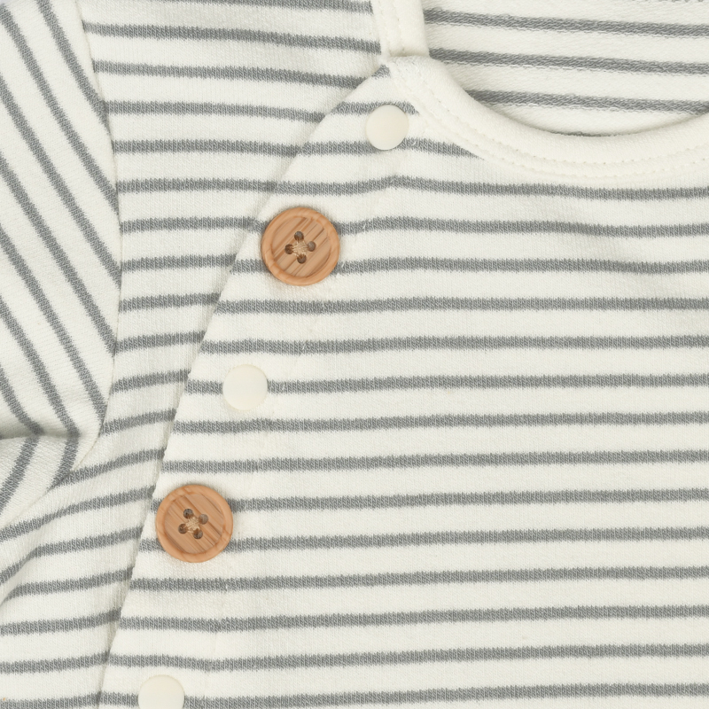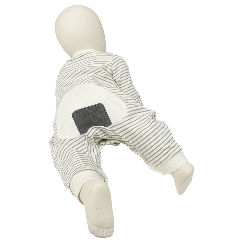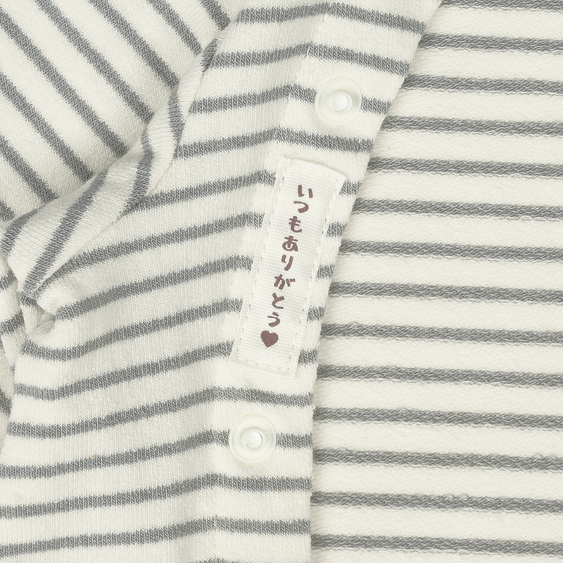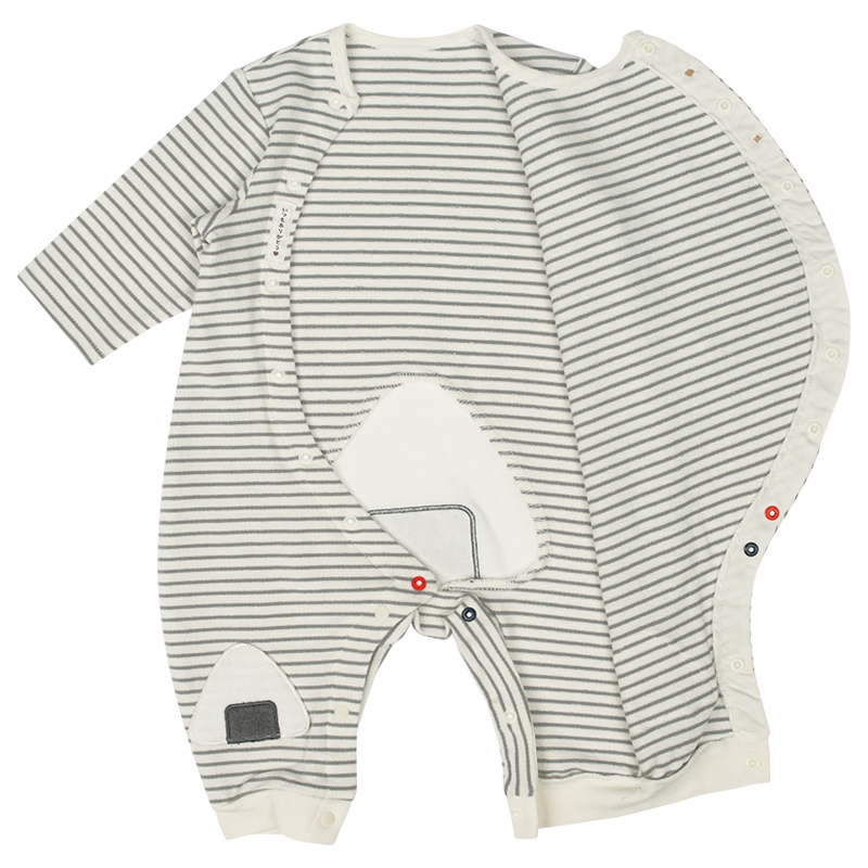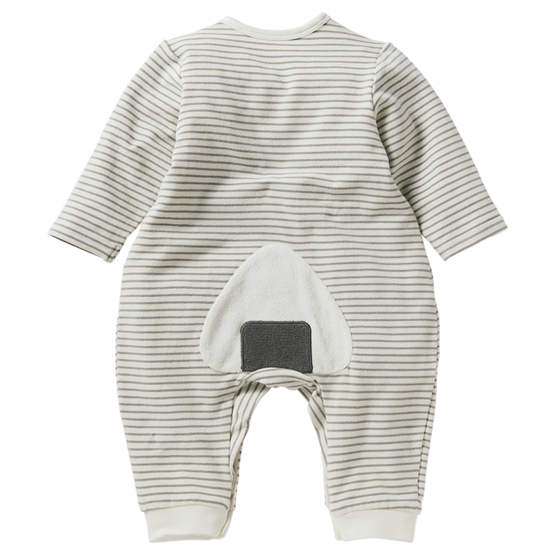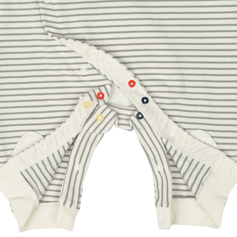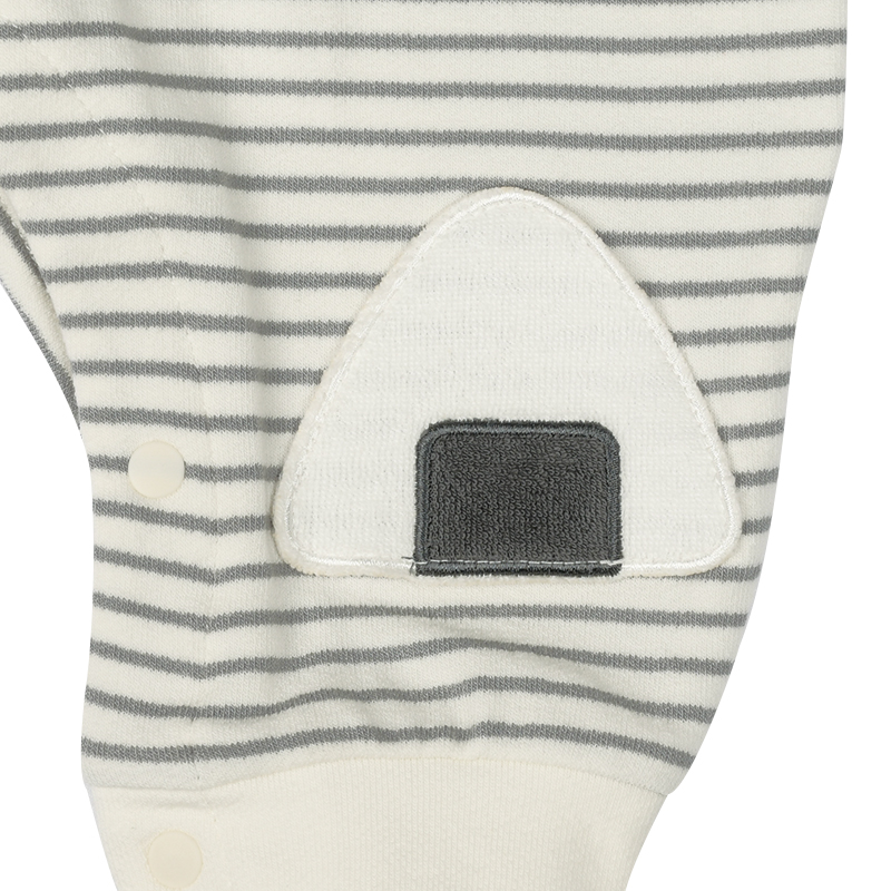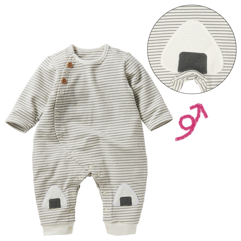 パイル地のかわいいアップリケ刺繍で、ハイハイ時期の赤ちゃんの膝を守ってくれます。 ハイハイしている姿がますます可愛く見えるよう、おしり部分にも膝部分のアップリケ刺繍と同じモチーフがデザインされています。 前開き+股下スナップで寝ている赤ちゃんのお着替えやおむつ替えもラクラクです。 前ホックを外すと、ほっこりしたサプライズも。