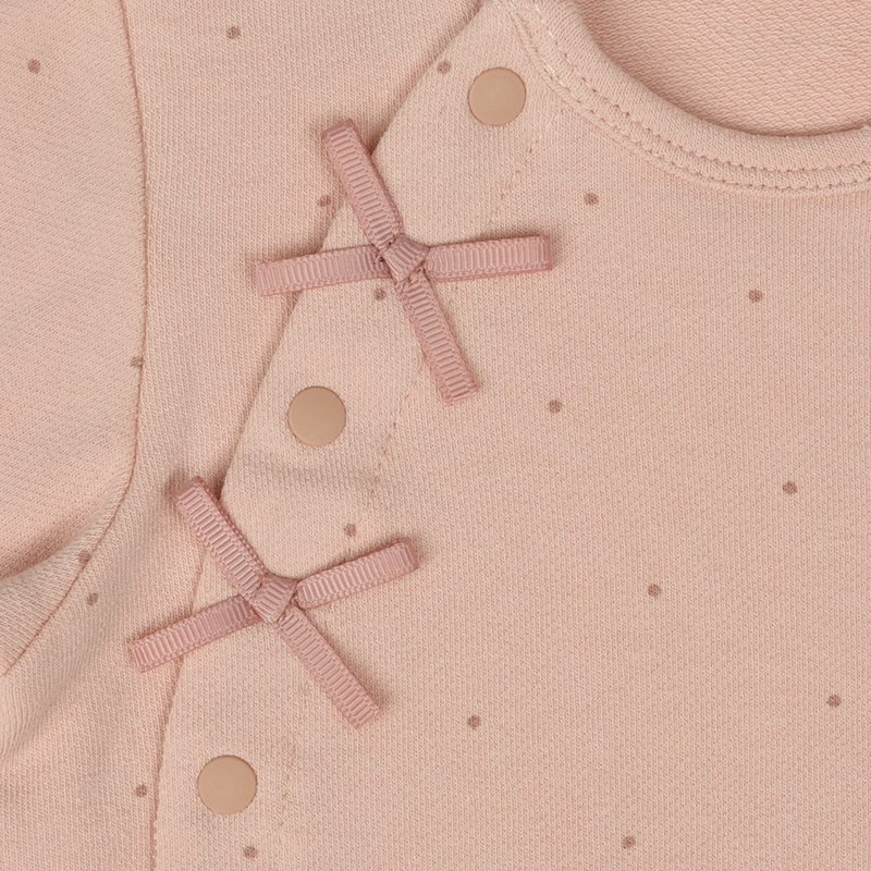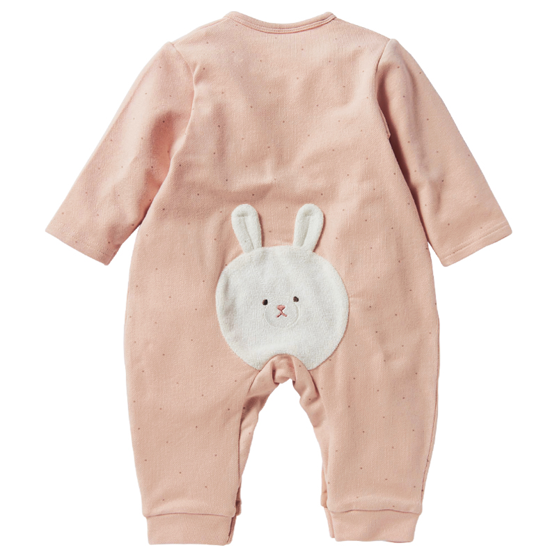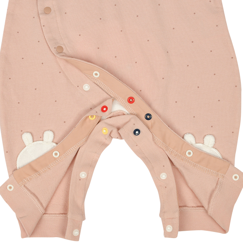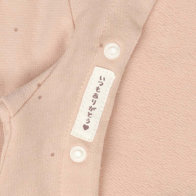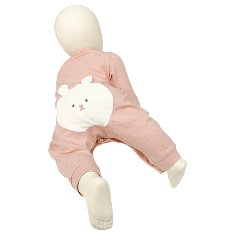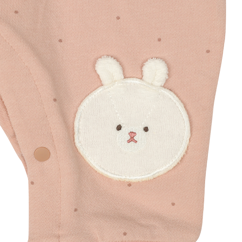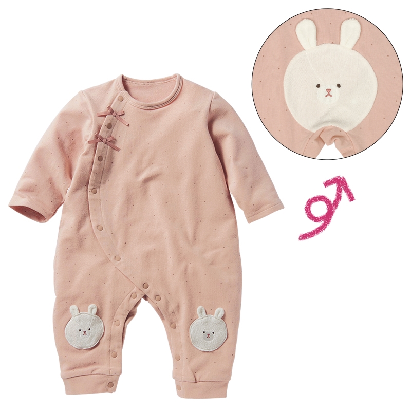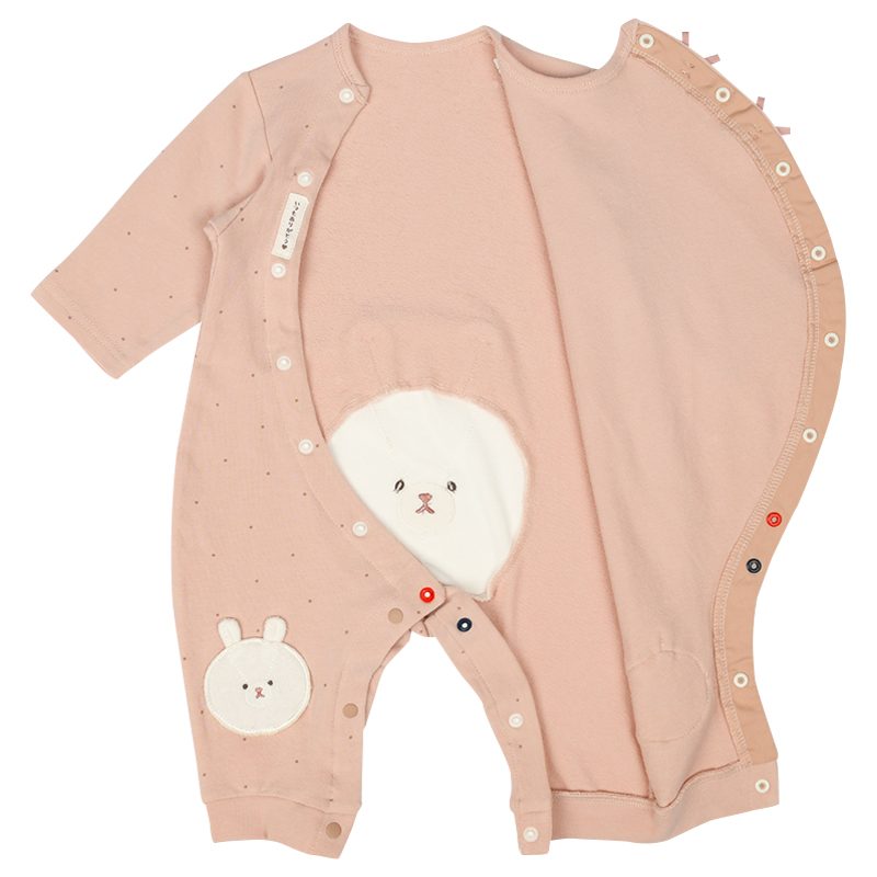 パイル地のかわいいアップリケ刺繍で、ハイハイ時期の赤ちゃんの膝を守ってくれます。 ハイハイしている姿がますます可愛く見えるよう、おしり部分にも膝部分のアップリケ刺繍と同じモチーフがデザインされています。 前開き+股下スナップで寝ている赤ちゃんのお着替えやおむつ替えもラクラクです。 前ホックを外すと、ほっこりしたサプライズも。
