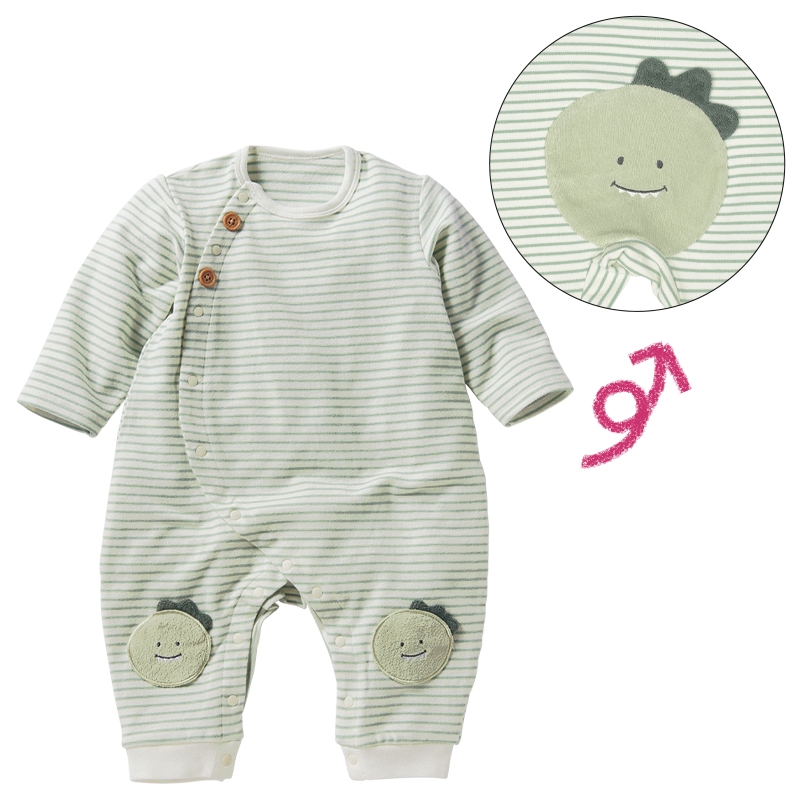 パイル地のかわいいアップリケ刺繍で、ハイハイ時期の赤ちゃんの膝を守ってくれます。 ハイハイしている姿がますます可愛く見えるよう、おしり部分にも膝部分のアップリケ刺繍と同じモチーフがデザインされています。 前開き+股下スナップで寝ている赤ちゃんのお着替えやおむつ替えもラクラクです。 前ホックを外すと、ほっこりしたサプライズも。