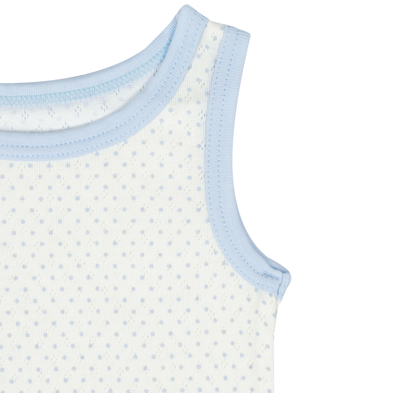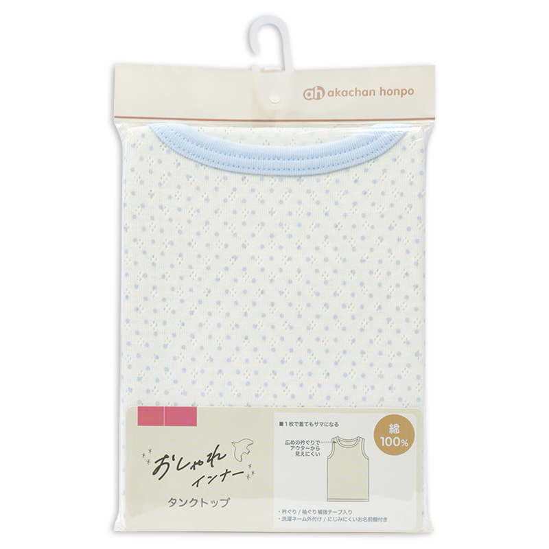 1枚できてもサマになる、おしゃれなタンクトップ型の肌着。 綿100%素材で肌ざわりが柔らかく、敏感なお子さまの肌にも安心。 洗濯ネームは肌にふれない外側に配置し、着用時のチクチクを防止。 さらに、にじみにくいお名前欄付きで、保育園でのお着替えにも便利です。