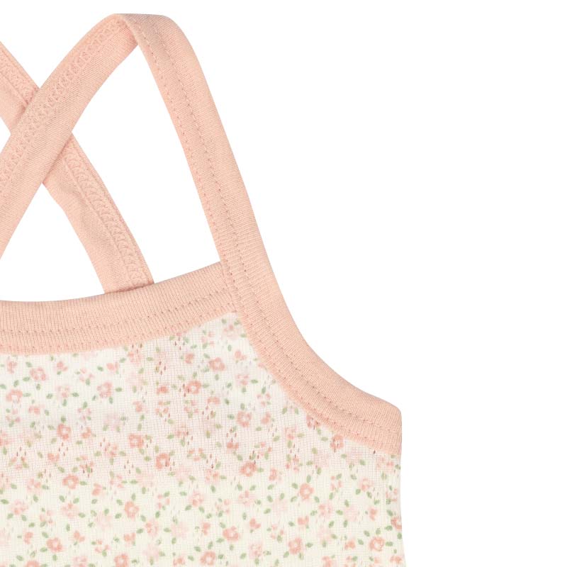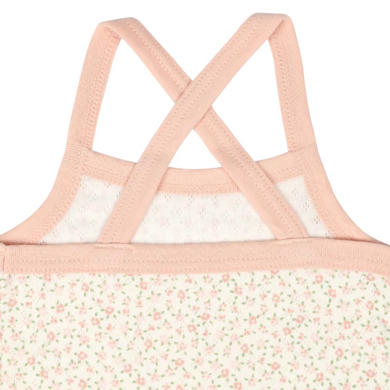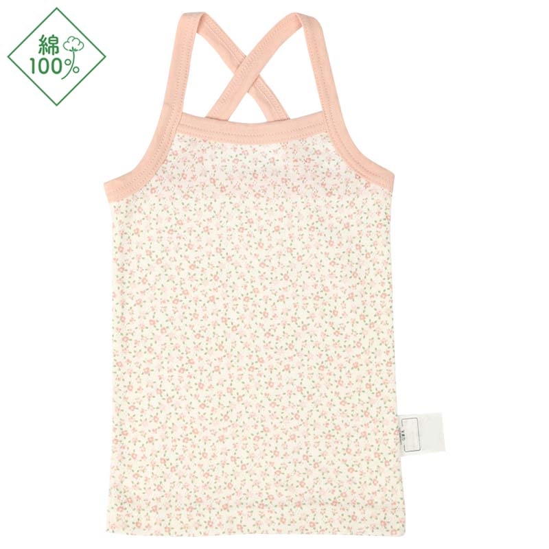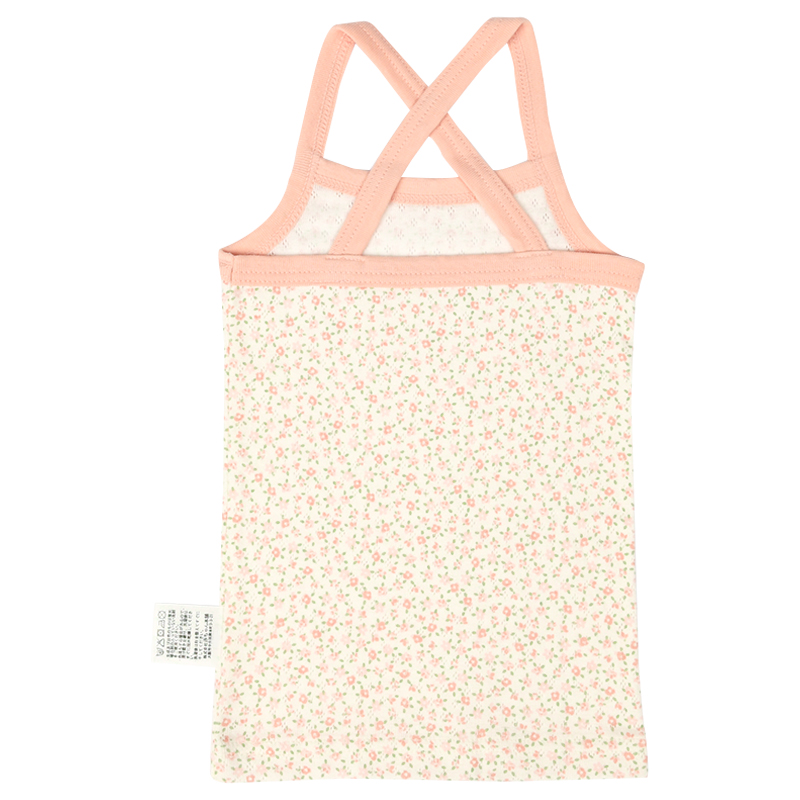 1枚できてもサマになる、おしゃれなキャミソール型の肌着。 綿100%素材で肌ざわりが柔らかく、敏感なお子さまの肌にも安心。 洗濯ネームは肌にふれない外側に配置し、着用時のチクチクを防止。 さらに、にじみにくいお名前欄付きで、保育園でのお着替えにも便利です。