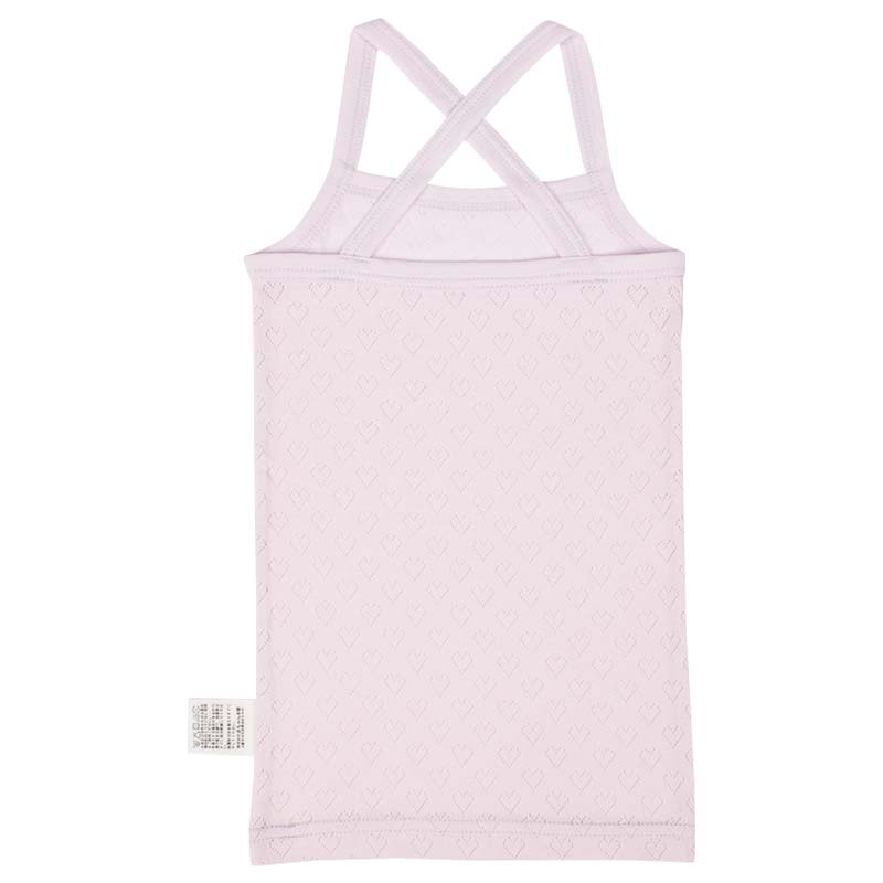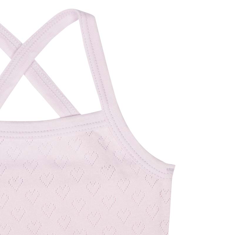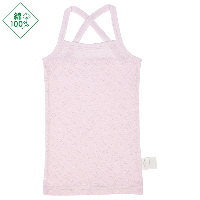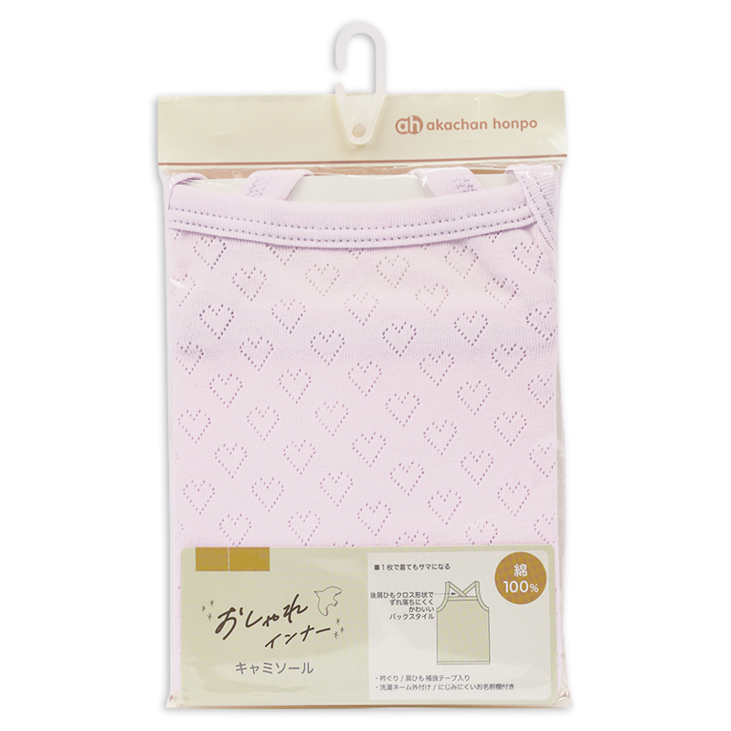 1枚できてもサマになる、おしゃれなキャミソール型の肌着。 綿100%素材で肌ざわりが柔らかく、敏感なお子さまの肌にも安心。 洗濯ネームは肌にふれない外側に配置し、着用時のチクチクを防止。 さらに、にじみにくいお名前欄付きで、保育園でのお着替えにも便利です。