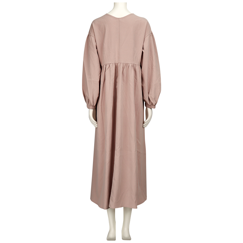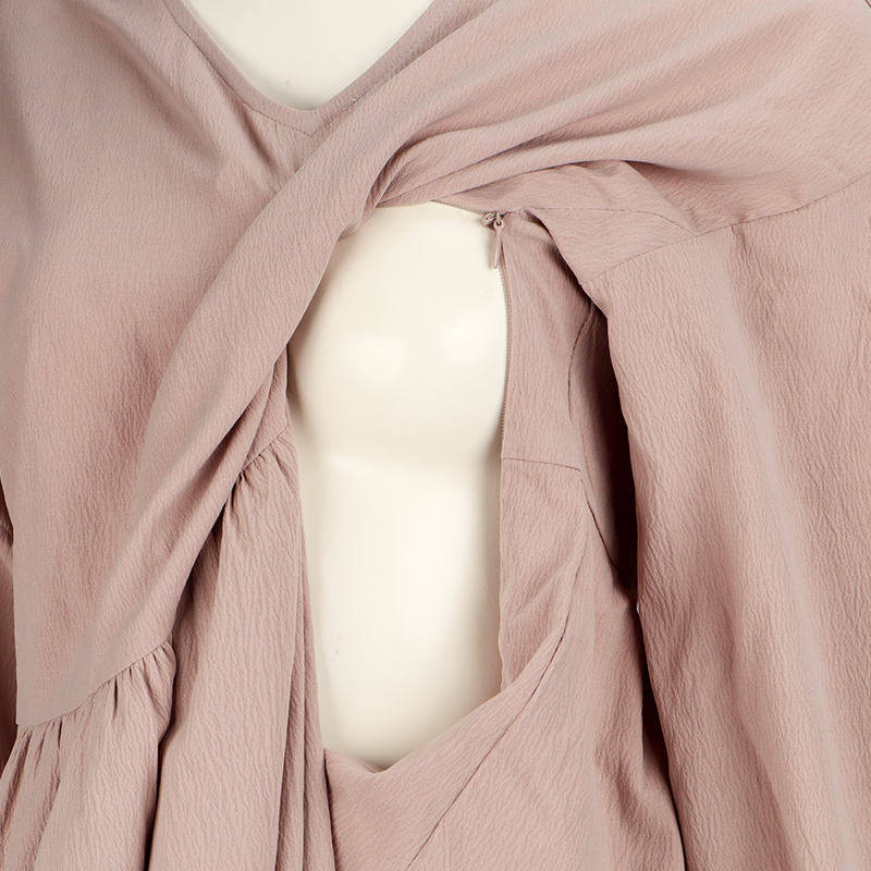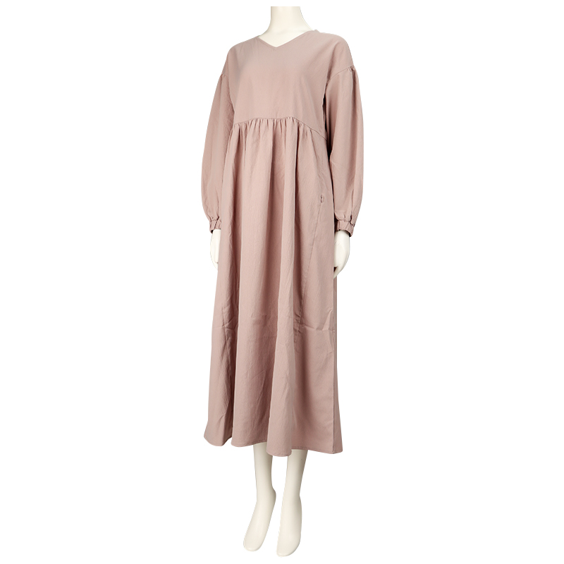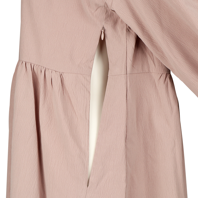 トレンド感のあるギャザーワンピースですが、ママになる方からリアルママにもお勧めなワンピースです。 授乳口部分は目立たないコンシールファスナーを使い、スライダーの引手を下側にしファスナーがあることがわかりにくいようにしています。 袖口に分量感をだしおしゃれ度をUPさせていますが、袖口がゴム仕様にし、いろいろな作業時にも邪魔になりません。 素材の表面にもナチュラルなしぼ感がある為しわが目立ちにくく、また着心地が楽でも、きちっと感があるワンピースです。