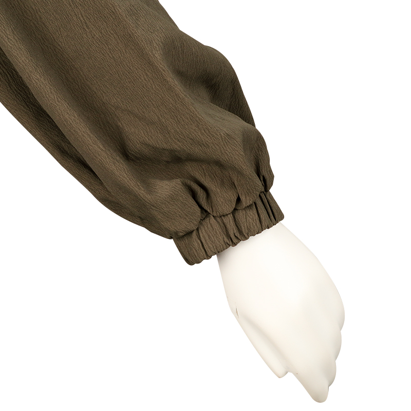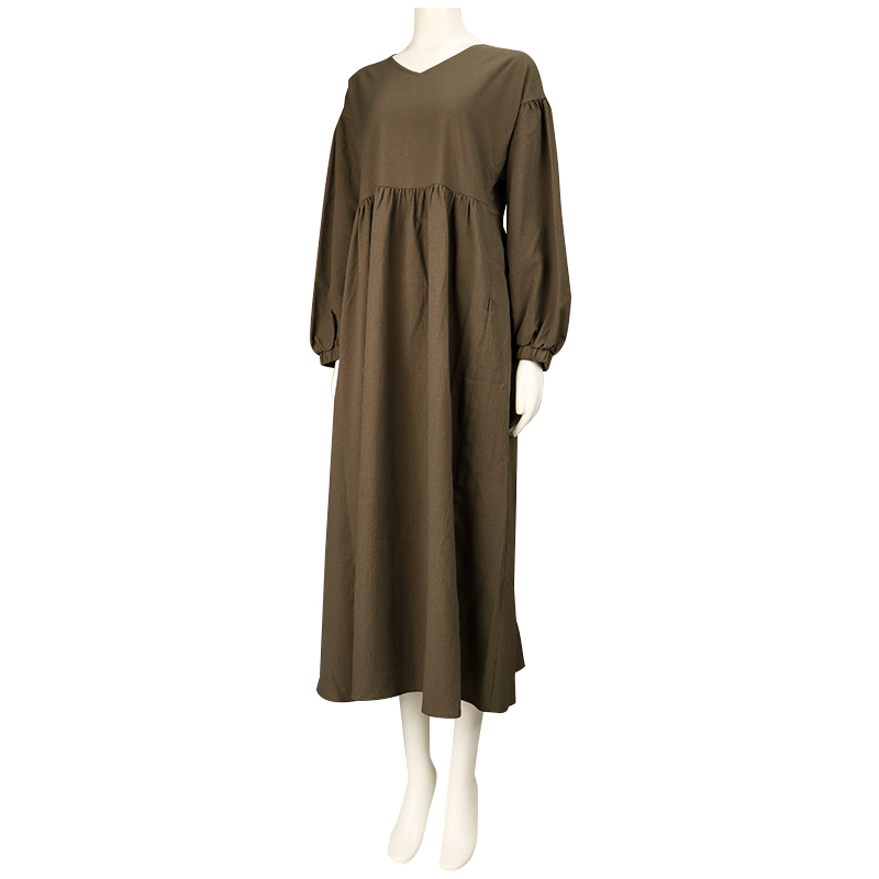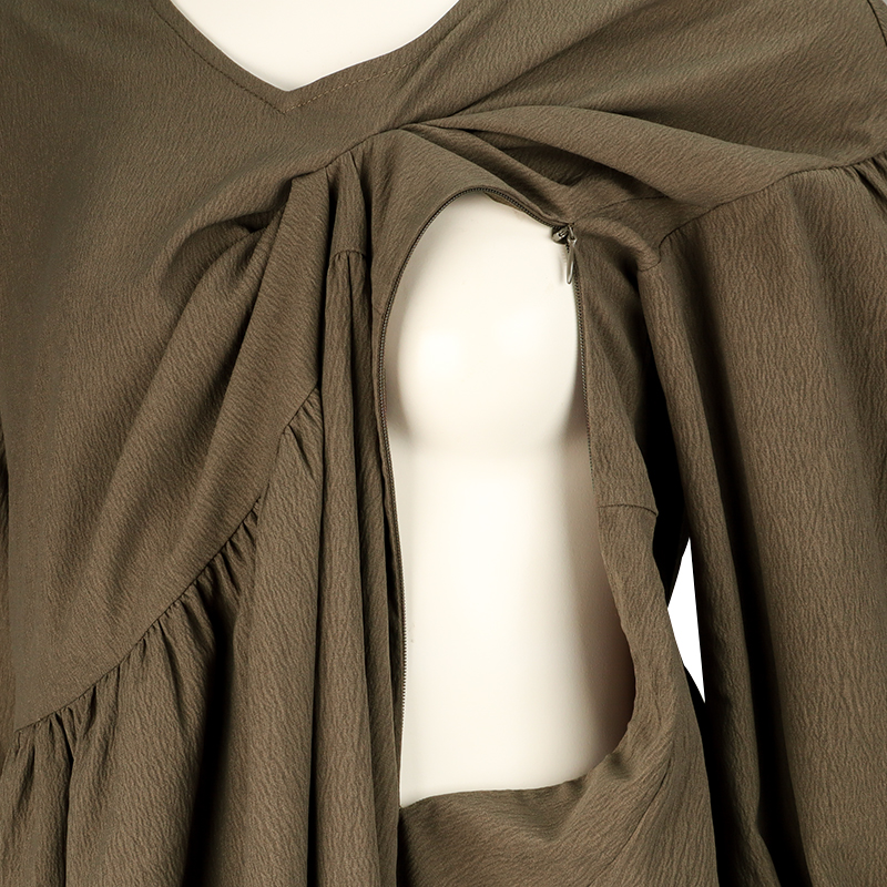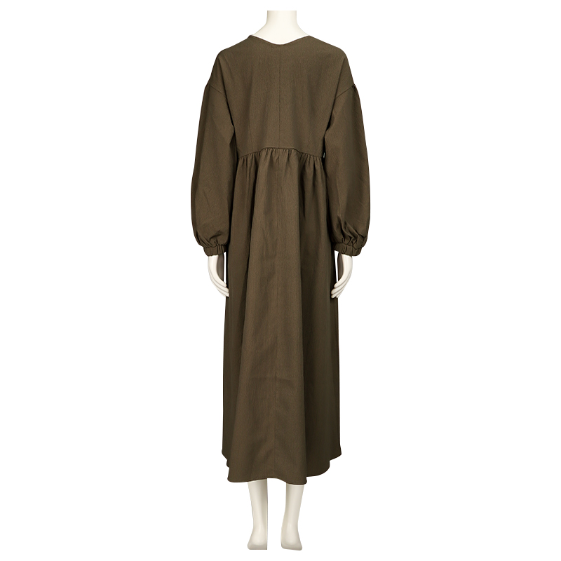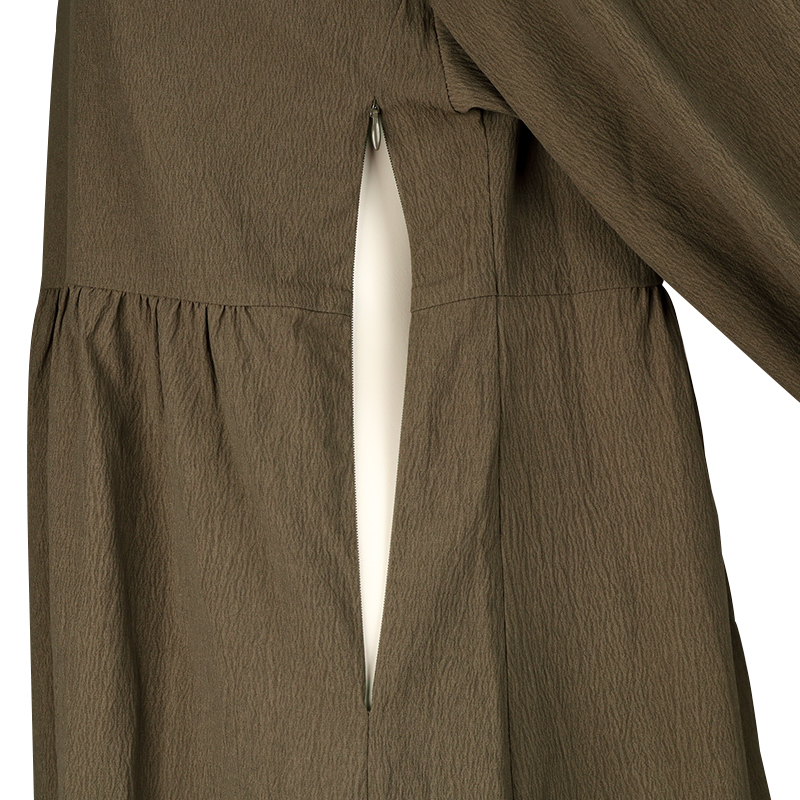 トレンド感のあるギャザーワンピースですが、ママになる方からリアルママにもお勧めなワンピースです。 授乳口部分は目立たないコンシールファスナーを使い、スライダーの引手を下側にしファスナーがあることがわかりにくいようにしています。 袖口に分量感をだしおしゃれ度をUPさせていますが、袖口がゴム仕様にし、いろいろな作業時にも邪魔になりません。 素材の表面にもナチュラルなしぼ感がある為しわが目立ちにくく、また着心地が楽でも、きちっと感があるワンピースです。