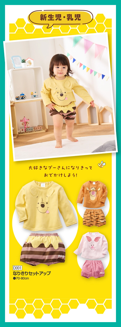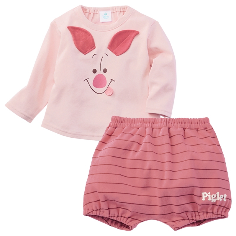 秋向け乳児アウター、プーさんキャラクターのなりきりTシャツ・ブルマセット商品になります。 素材は肌に優しい綿100%のスムースになります。 サイズは、生まれて半年頃の70cm,1年程の80cm の2サイズ展開、 柄は、プーさんセット,ピグレットセット,ティガーセットの3種類になります。