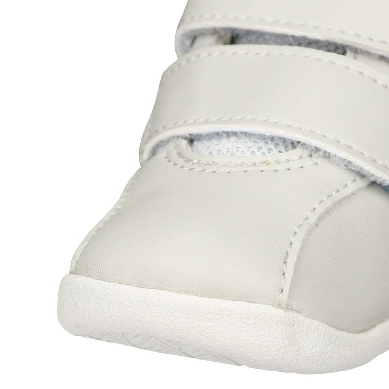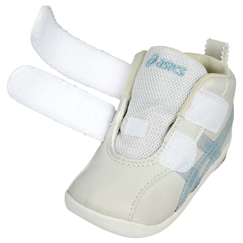 履き口は脱ぎ履きしやすいオープンベロ構造。 靴底全体のエッジを丸くすることでぐらつきやすい赤ちゃんの歩行で起こりがちな引っかかりを軽減。 吸汗速乾性にすぐれ、肌にやさしい低刺激性の素材メディエルを採用しています。