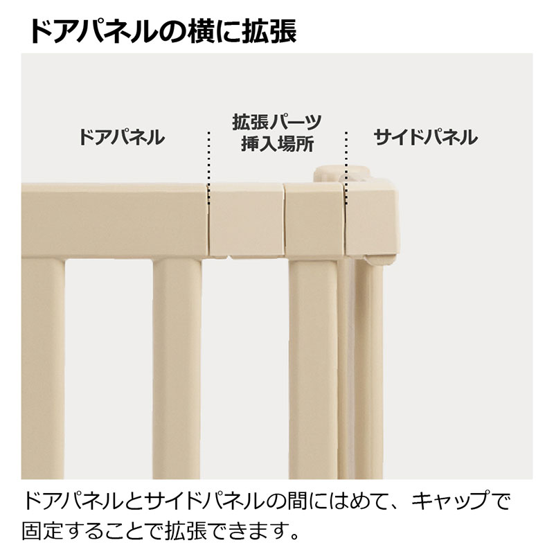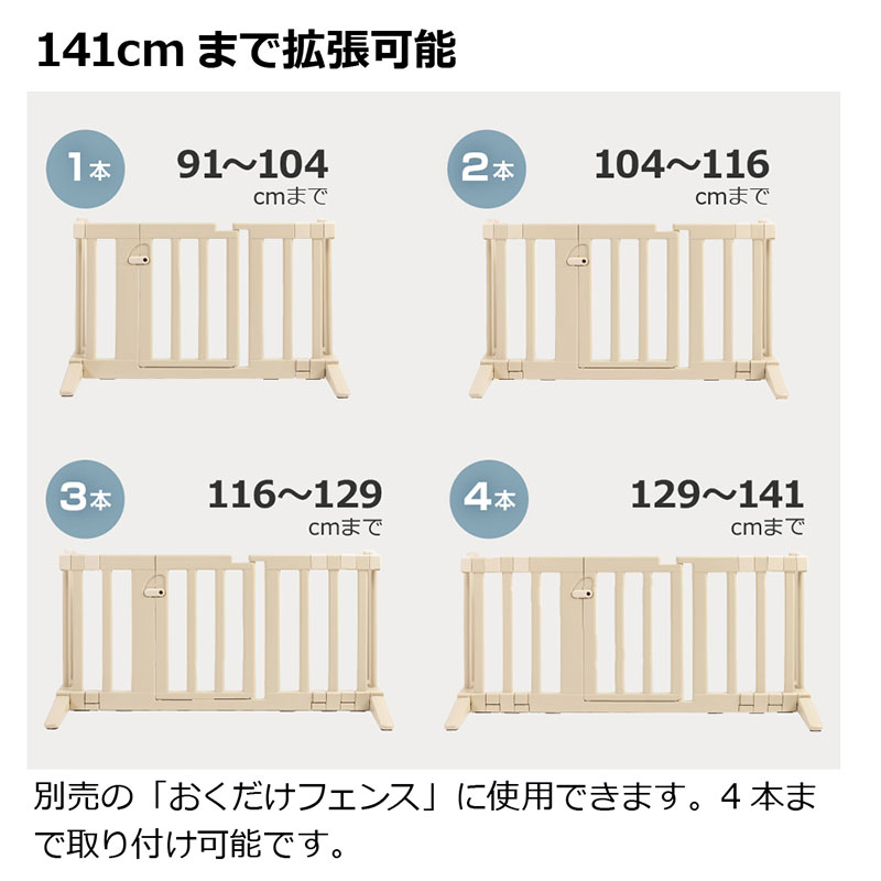 おくだけフェンス用拡張パーツです。 置く場所に合わせて、4本まで取り付け可能です。 おくだけフェンスは、 進入して欲しくない場所に置くだけで、簡単に設置できます。 壁をキズつける心配がない置くだけのタイプです。 ズレにくく、床をキズ付けにくい滑り止め付きです。 サイドパネルで、フェンスのすき間からの進入も防止します。 サイドパネルに水を入れることで、 フェンス自体が重くなり、設置場所からのズレを防止します。 ※サイドパネルに入れる水の量は必ず守ってください。(約2.8L) 少ないと事故や転倒の原因となります。 ロック機能付きドアパネルでロック部は子供があけにくい構造です。