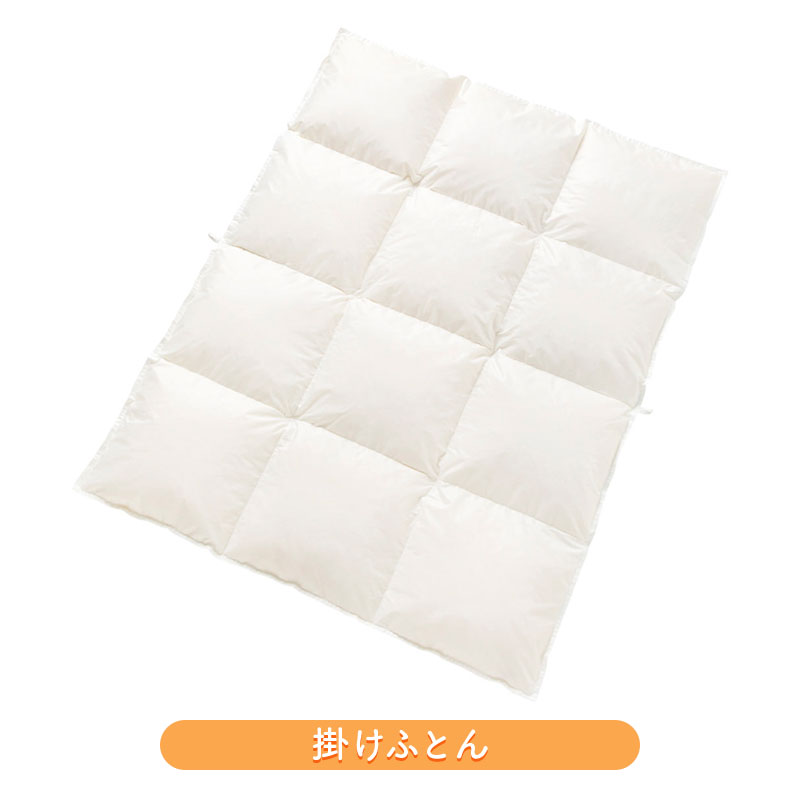 ーーーーーーーーーー ●セット内容: ・羽毛掛けふとん ・掛けふとんカバー ・敷きふとん ・フィッティングシーツ ・まくら ・まくらカバー ・防水キルトパッド ●サイズ(約・cm): [羽毛掛けふとん]85×115 [掛けふとんカバー]90×120 [敷きふとん]70×120 [フィッティングシーツ]70×120 [まくら]20×28 [まくらカバー]22×30 [防水キルトパッド]70×120 ●素材: [羽毛掛けふとん](ふとんがわ)ポリエステル85%・綿15% (詰めもの)ダウン85%・フェザー15% [掛けふとんカバー]綿100% [敷きふとん](側地)ポリエステル100% (中材)ポリエーテルエステルエラストマー [フィッティングシーツ]綿100% [まくら](側地)ポリエステル65%・綿35% (詰めもの)ポリエステル100% [まくらカバー]綿100% [防水キルトパッド](表地)ポリエステル65%・綿35% (裏地)ポリエステル不織布※ポリウレタン樹脂加工 (詰めもの)ポリエステル100% ●洗濯表示: [羽毛掛けふとん]洗濯機可(ネット使用)・乾燥機可(排気温度上限60℃) [掛けふとんカバー]洗濯機可(ネット使用) [敷きふとん](側地)洗濯機可(ネット使用)・(中材)シャワー洗い可 [フィッティングシーツ]洗濯機可(ネット使用) [まくら]洗濯機可(ネット使用) [まくらカバー]洗濯機可(ネット使用) [防水キルトパッド]洗濯機可(ネット使用) ※洗濯方法については取扱説明書をご確認ください。