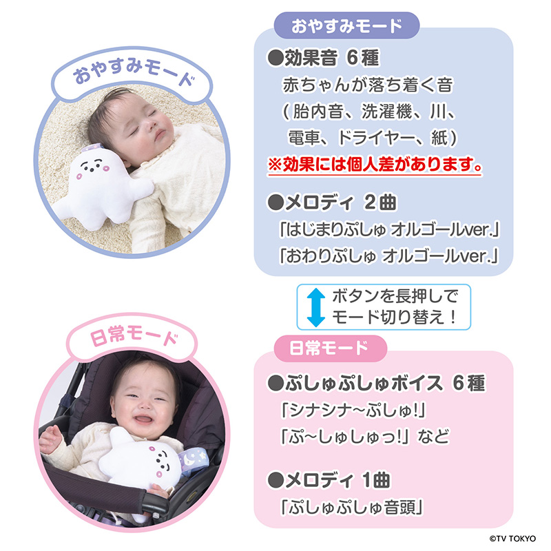 ●対象年齢:3ヵ月~ ●使用電池:単4×3本(別売) ●その他: [日常モード]ぷしゅぷしゅボイス6種・メロディ1曲 [おやすみモード]効果音6種・メロディ2曲 (c) TV TOKYO