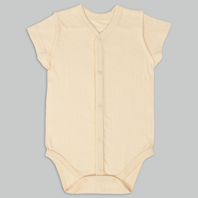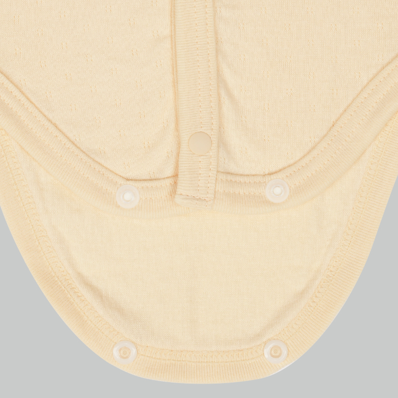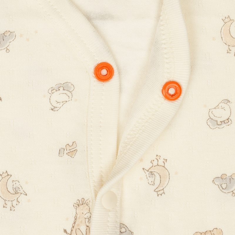 本体に使用している接結生地は、2枚の生地を重ねて部分的に接結(つなぎ合わせる)した素材で 空気を含んだ柔らかい風合いが特徴です。空気の層ができることで、暖かさを保ちやすい素材です。 前開きなので大きく開いてお着替えラクラク。 股ボタン開閉でおむつ替えもカンタンです。 洗い替えに便利な2枚組のロンパース