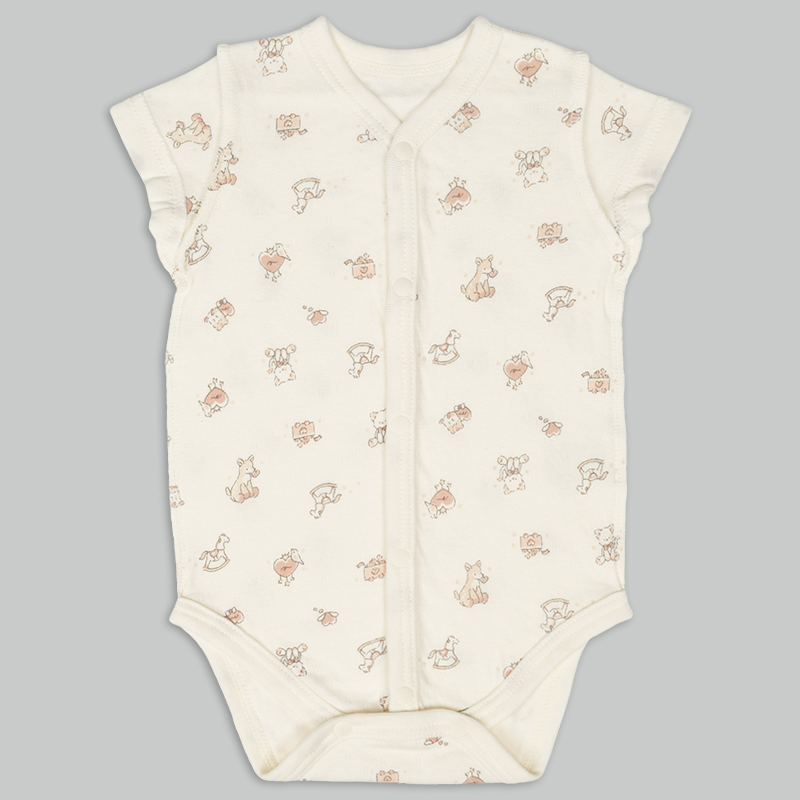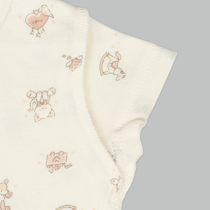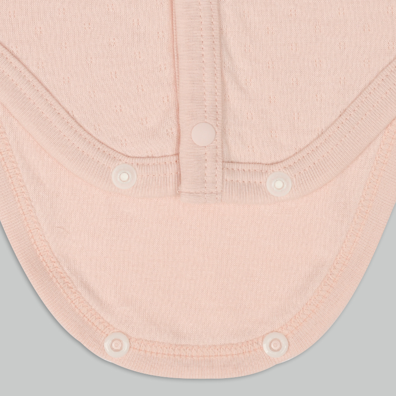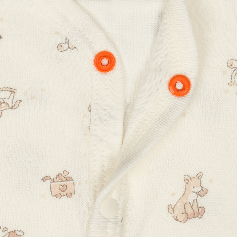 本体に使用している接結生地は、2枚の生地を重ねて部分的に接結(つなぎ合わせる)した素材で 空気を含んだ柔らかい風合いが特徴です。空気の層ができることで、暖かさを保ちやすい素材です。 前開きなので大きく開いてお着替えラクラク。 股ボタン開閉でおむつ替えもカンタンです。 洗い替えに便利な2枚組のロンパース