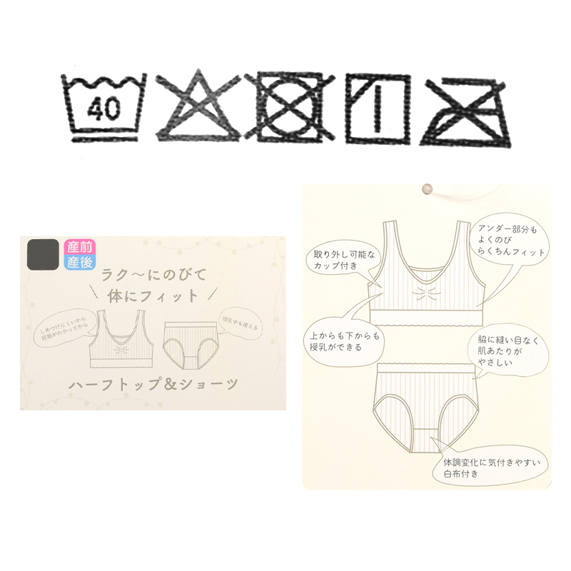 ハーフトップ 組成表示 レーヨン56%ナイロン39%ポリウレタン5% テープ部分・ゴム部分ナイロン88%ポリウレタン12% Mサイズ 身丈29cm 天巾16cm 身巾33cm 肩接 4cm AH 18cmMサイズ ハーフトップ L寸 身丈31cm 天巾17cm 身巾35cm 肩接 4cm ショーツ M寸 身丈26cm 身巾29cm 天巾28cm 足口21cm L寸 身丈28cm 身巾31cm 天巾30cm 足口22cm