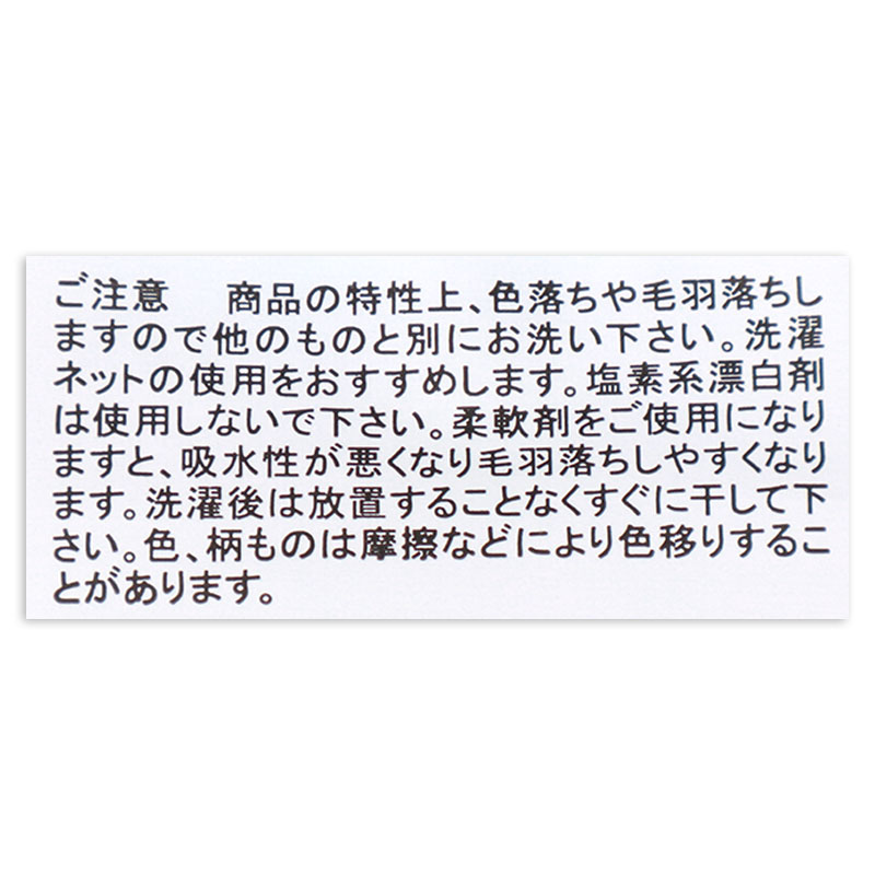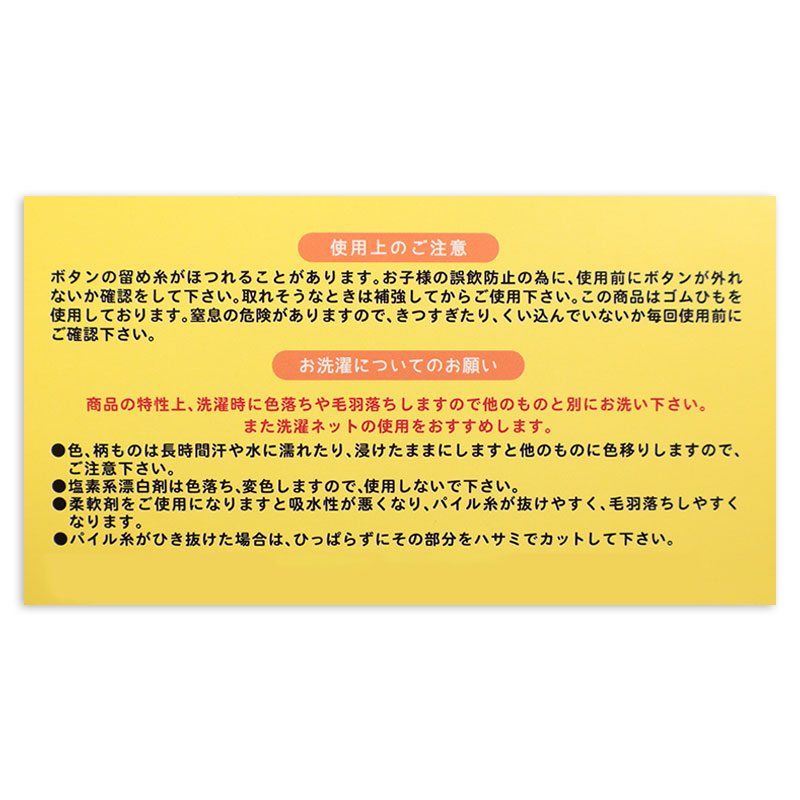 約34×35cm 綿100% 中国製 ●使用上のご注意 ボタンの留め糸がほつれることがあります。お子様の誤飲防止の為に、使用前にボタンが外れないか確認をしてください。 取れそうなときは補強してからご使用ください。 この商品はゴムひもを使用しております。 窒息の危険がありますので、きつすぎたり、くい込んでいないか毎回使用前にご確認ください。 ●お洗濯についてのお願い 商品の特性上、洗濯時に色落ちや毛羽落ちしますので他のものと別にお洗いください。 また洗濯ネットの使用をおすすめします。 色、柄ものは長時間汗や水に濡れたり、浸けたままにしますと他のものに色移りしますので、ご注意ください。 塩素系漂白剤は色落ち、変色しますので、使用しないでください。 柔軟剤をご使用になりますと吸水性が悪くなり、パイル糸が抜けやすく、毛羽落ちしやすくなります。 パイル糸が引き抜けた場合は、ひっぱらずにその部分をハサミでカットしてください。