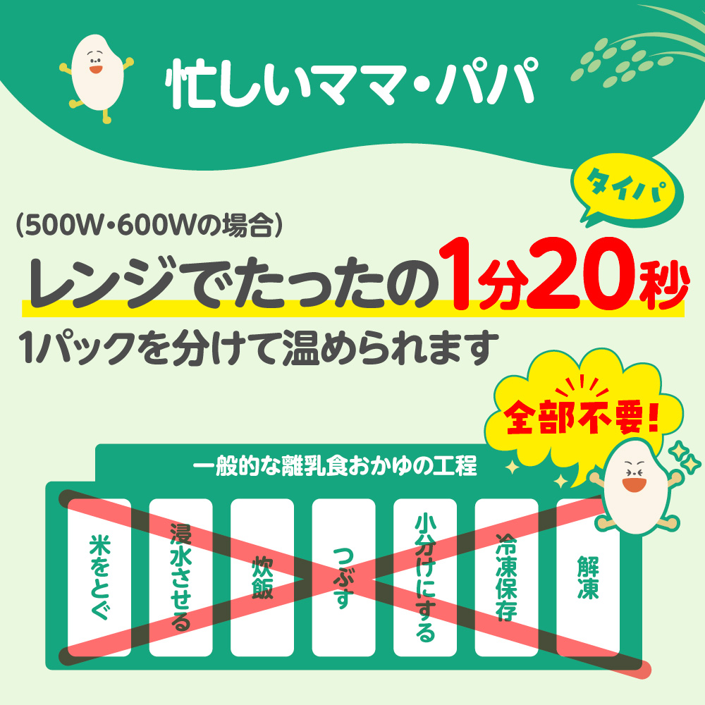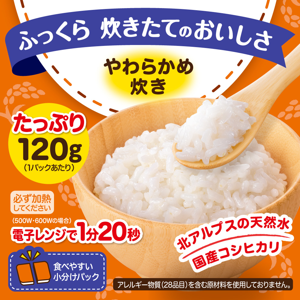 電子レンジで1分20秒 1才6ヵ月頃から。120g×6パック入。 ●炊き立てのような美味しさ お米本来のおいしさを炊き立てふっくら食感で味わえます。 ●北アルプスの天然水と国産コシヒカリを使用 原材料はこだわった水とお米だけ