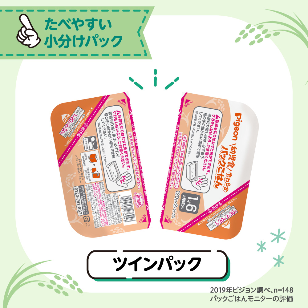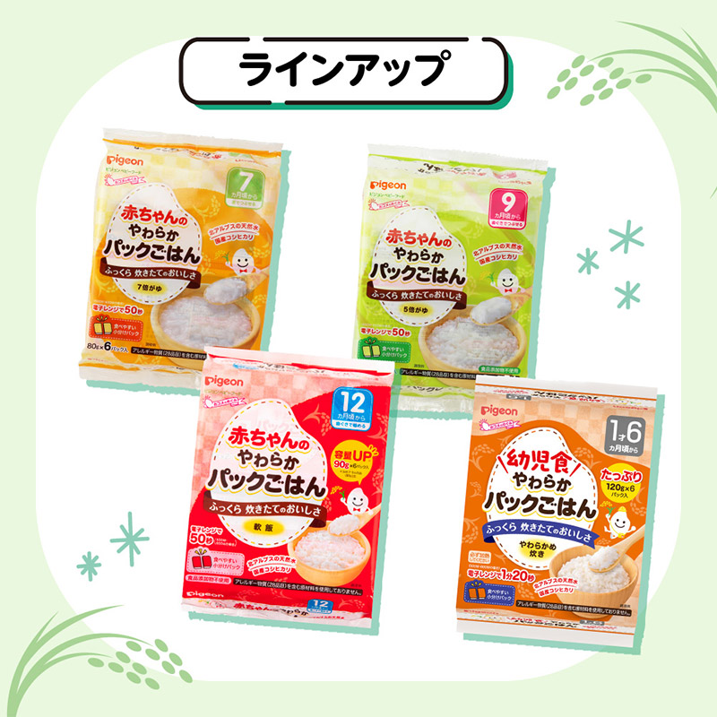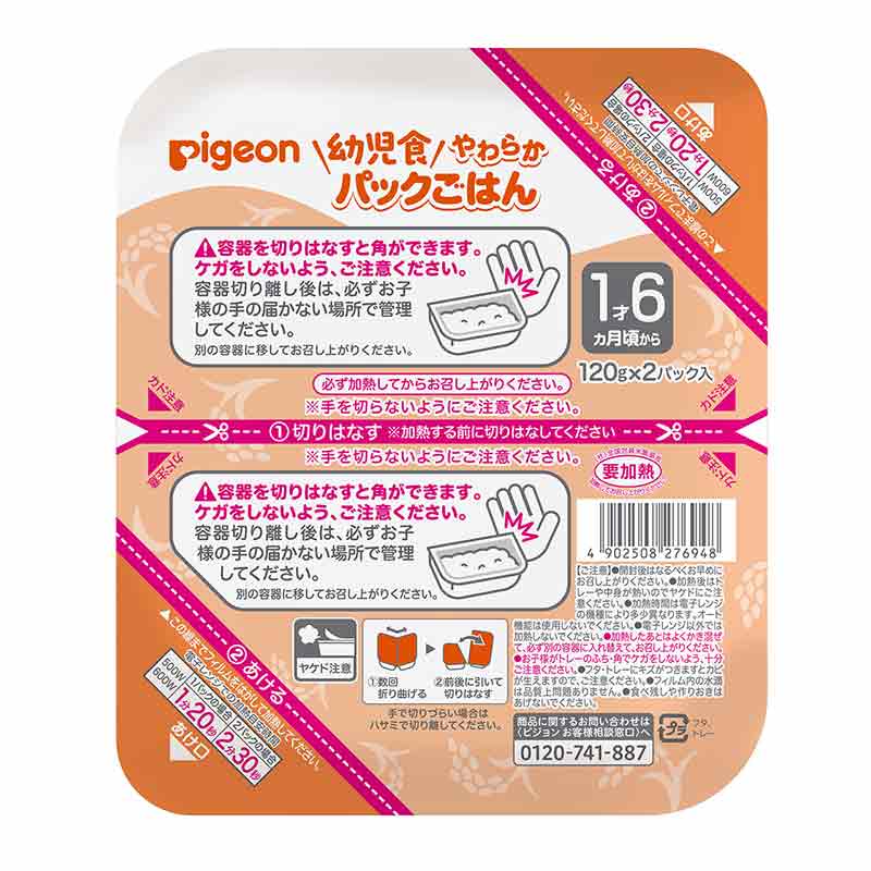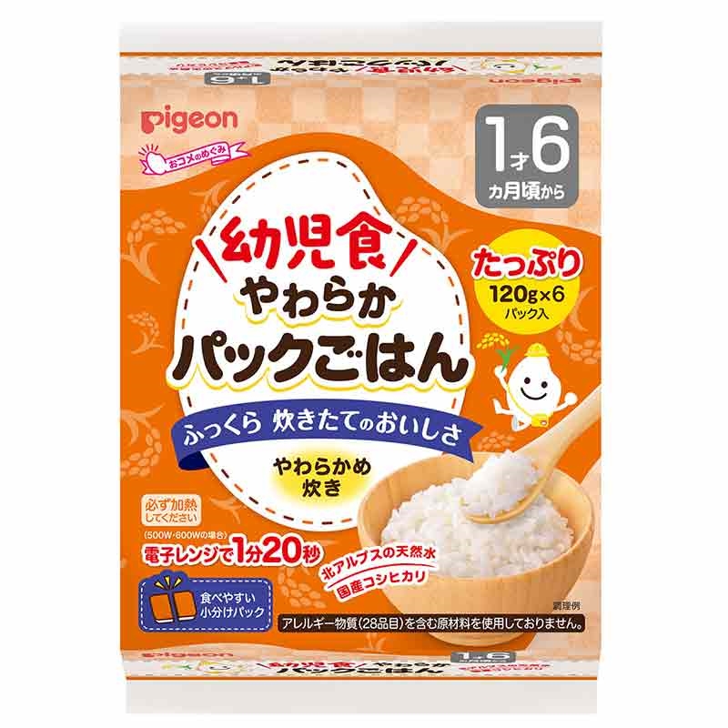 ●幼児食 やわらかパックごはん 1才6ヵ月 ●原材料名:うるち米(国産) ●内容量:120g×6個 ●栄養成分:1パック当たり 熱量 155kcal たんぱく質 2.16g 脂質 0.48g 炭水化物 35.5g ナトリウム mg