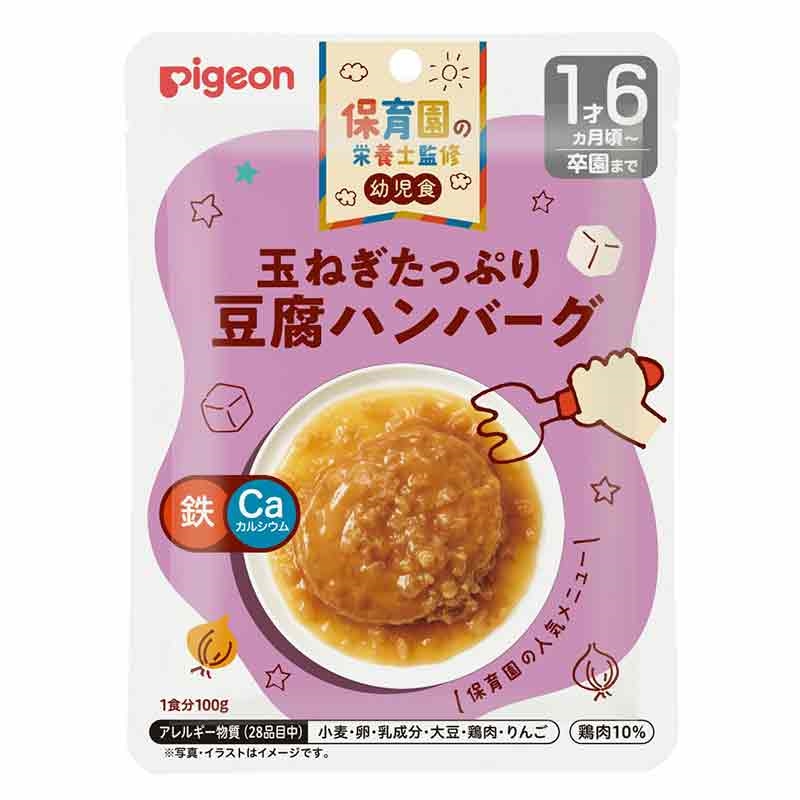 保育園の人気メニュー 玉ねぎと大根を使用し、素材本来の味を大切にした豆腐ハンバーグです。 ・1才6ヵ月頃~卒園まで ・保育園の栄養士監修 ・ピジョングループが運営する保育園の栄養士が監修し、お子さまの発達に考慮したおいしさ、具材の大きさや固さにこだわりを持って開発しました。 ・調理済みですので、器に移してそのままお召し上がりいただけます。