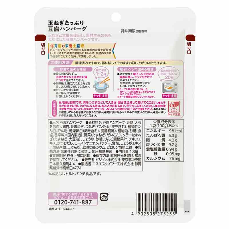 ●保育園の栄養士監修幼児食 玉ねぎたっぷり豆腐ハンバーグ ●原材料名:豆腐ハンバーグ(豆腐(大豆を含む)、鶏肉、たまねぎ、つなぎ(パン粉(小麦を含む)、植物性たん白、でん粉、乾燥卵白(卵を含む)、脱脂粉乳)、植物油、砂糖、食塩、香辛料)(国内製造)、野菜(たまねぎ、だいこん)、ソテーたまねぎ(たまねぎ、大豆油)、しょうゆ、砂糖、りんご濃縮果汁、チキンエキス、かつおだし、ローストオニオンパウダー、食塩、しょうがエキス/増粘剤(加工でん粉)、炭酸カルシウム、ピロリン酸第二鉄 ●内容量:100g ●栄養成分:1袋当たり 熱量 98kcal たんぱく質 5.3g 脂質 4.2g 炭水化物 9.7g 鉄 0.95mg カルシウム 75mg 1才6ヵ月頃~卒園まで お湯で温める場合 袋のまま1~2分 ●袋の封を切らずに、沸騰させて火を止めたお湯につけて温めてください。 ●加熱後は、袋の穴に、はしなどを差し込んで取り出してください。 ●切り口から封をあけ、器に移し、かき混ぜてお召し上がりください。 電子レンジで温める場合 加熱時間の目安500~600W20秒 ●必ず中身を電子レンジ対応の容器に移し、ラップをかけて温めてください。加熱後は、かき混ぜてからお召し上がりください。 ※本品はレトルトパウチ食品です ヤケド注意 ※ラップを取る際に熱くなった具やソースが跳ねることがありますので、ご注意ください。 ※オート機能は使用しないでください。 ご使用上の注意 ●月齢は目安です。具をつぶすなどして大きさ・固さを加減してあげてください。 ●お子様が自分でお召し上がりになる時は、飲み込み終わるまで、見守ってあげてください。 ●加熱後は中身が熱くなっていますので、ヤケドをしないように開封には十分ご注意ください。 ●熱くないか確認してからお子様にお与えください。 ●開封後はなるべく早めにお使いください。 ●食べ残しや作りおきは与えないでください。 アレルギー:小麦・卵・乳成分・大豆・鶏肉・りんご
