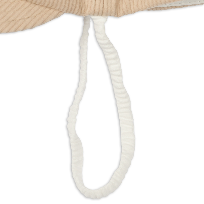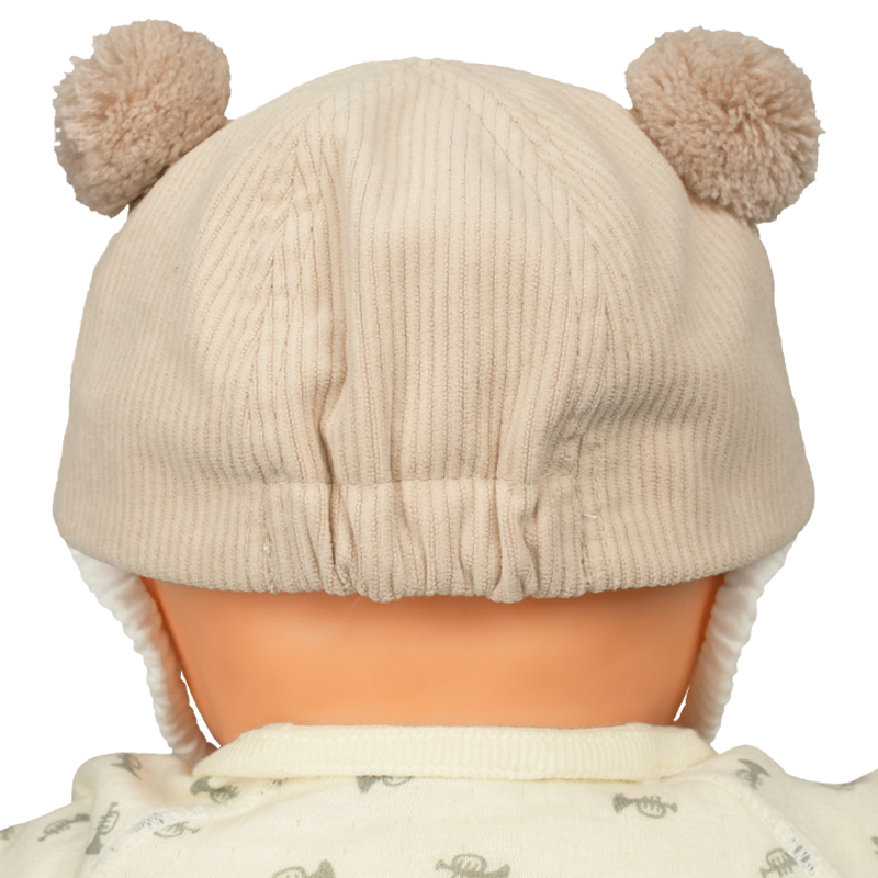 つぶらな瞳のくまフェイスがチャームポイントのアイテムです。 淡い色使いとコーデュロイの質感がやさしく馴染みます。 風などによる帽子の落下を防ぐアゴゴム付き。 アゴゴムは生地でくるんだ仕様なので肌あたりが優しいです。