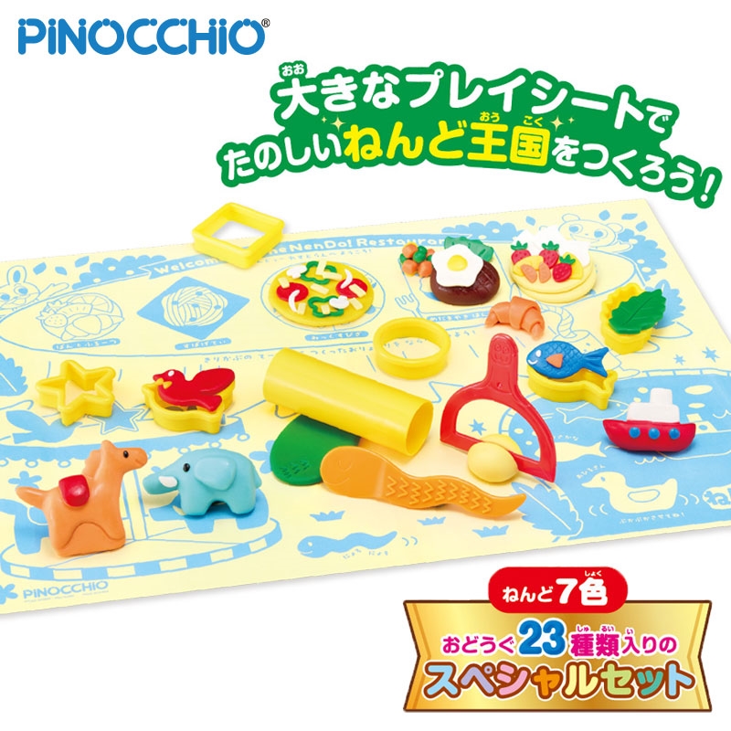 ●対象年齢:3歳~ ●使用電池:なし ●セット内容: ・4色のねんど(各約30g) ・3色のねんど(各約30g) ・かためんぬきがた2種類 ・とりさんはさみ×1 ・たんぽぽカッター×1 ・へびさんヘラ×1 ・さるくんカッター×1 ・りすさんのばしぼう×1 ・ぬきがた7種類 ・プレイシート×1 ・大きなねんど板×1 ・りったいぬきがた4種類 ・あざらしくんおしだしき3種類 ・おしだしぼう×1