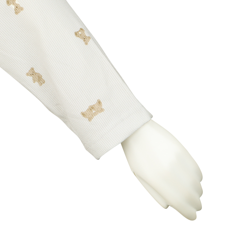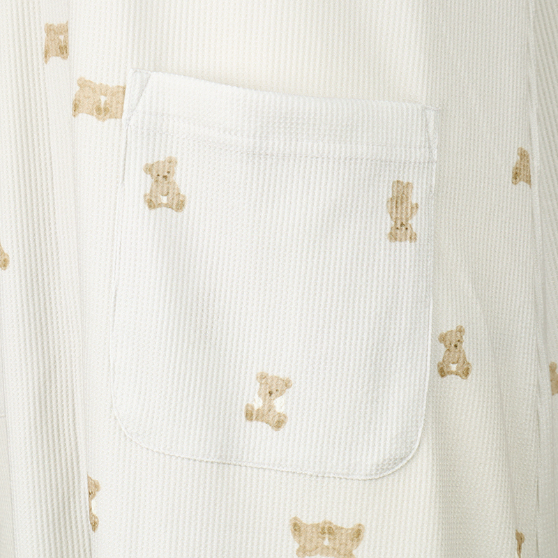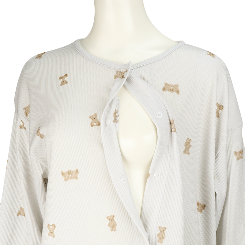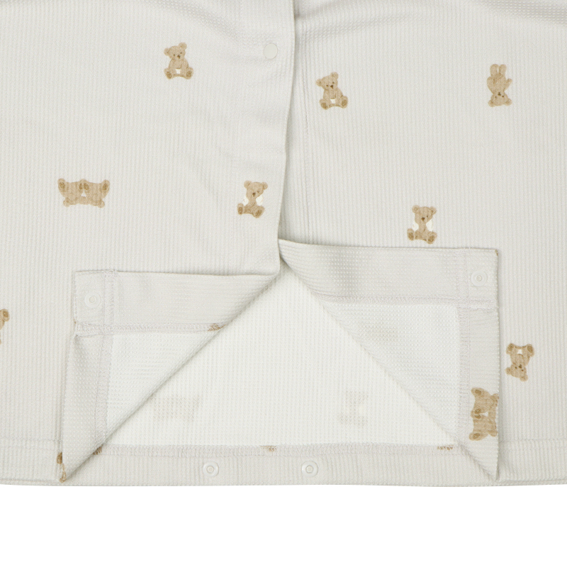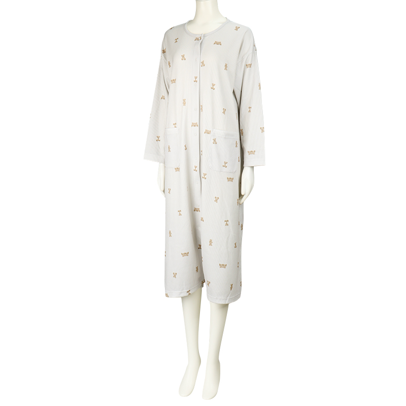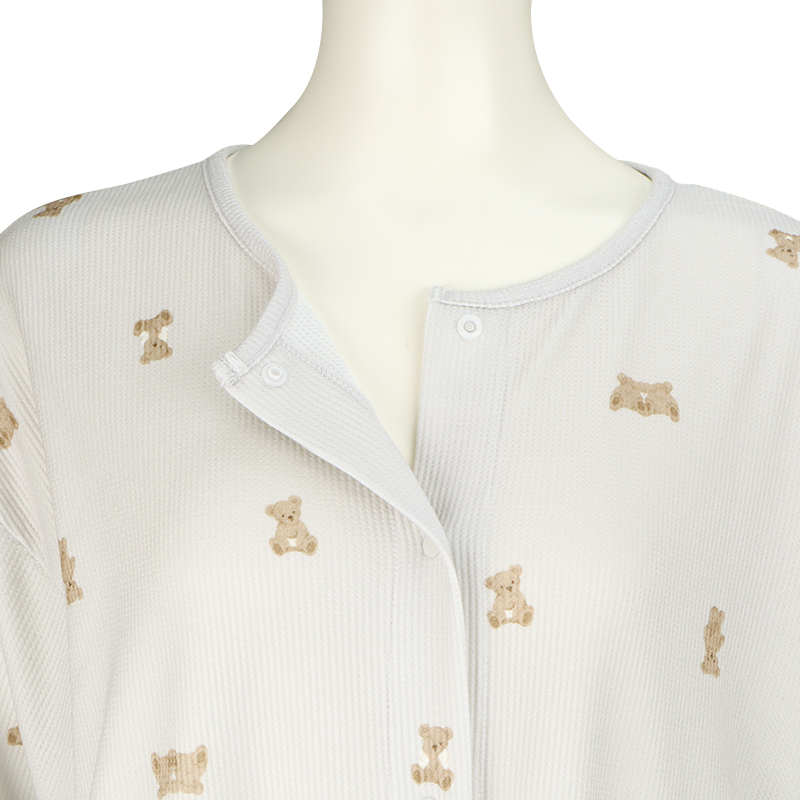 表面に凹凸感のある生地で、見た目にも可愛らしく、さらっとした肌ざわりで、軽やかな着心地です。 上から下まで全部スナップボタンなので、入院中の検診や帝王切開の時にも着脱簡単。 左右にスマホ等がすっぽり入るポケット付き。