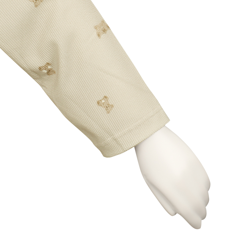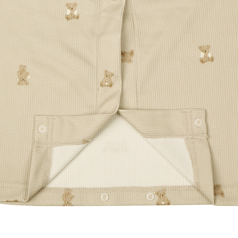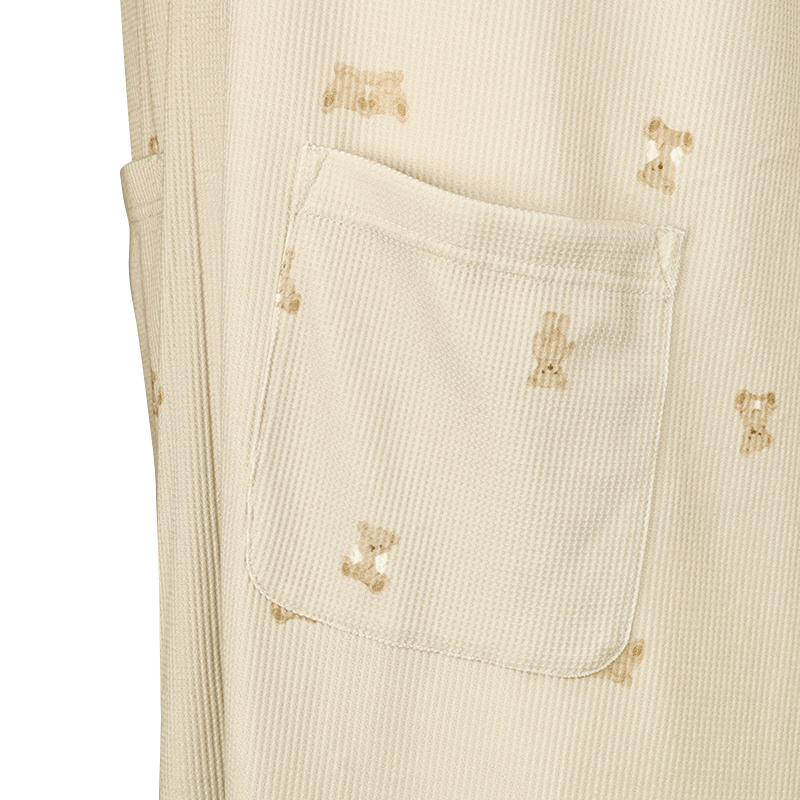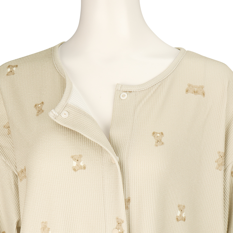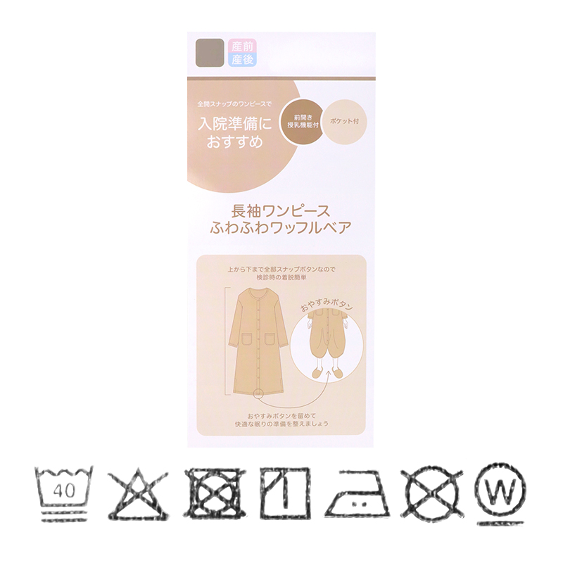 表面に凹凸感のある生地で、見た目にも可愛らしく、さらっとした肌ざわりで、軽やかな着心地です。 上から下まで全部スナップボタンなので、入院中の検診や帝王切開の時にも着脱簡単。 左右にスマホ等がすっぽり入るポケット付き。